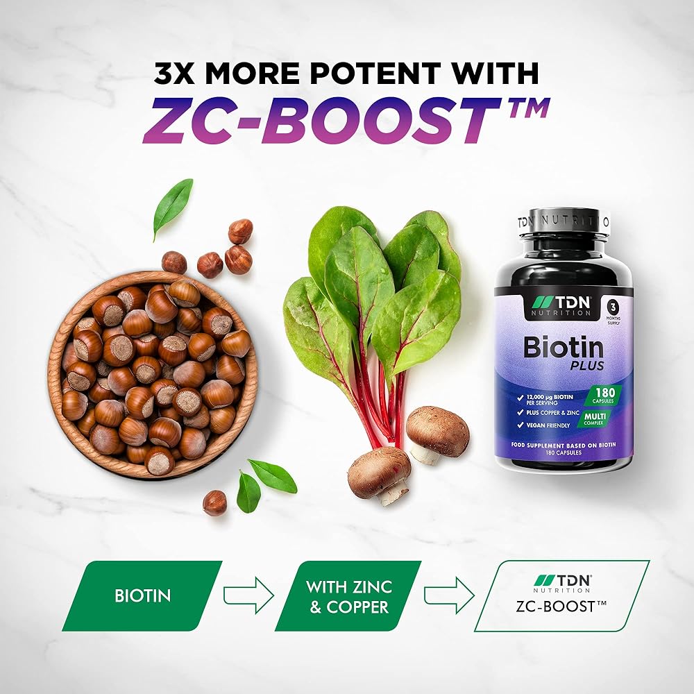 مكمل TDN البيوتين للشعر والبشرة والأظافر (12000 مجم لكل جرعة) - فيتامينات نمو الشعر للنساء والرجال - امتصاص أكبر بنسبة 50% مع مركب d-biotin الطبيعي وzc-Boost™ الزنك والنحاس - نباتي