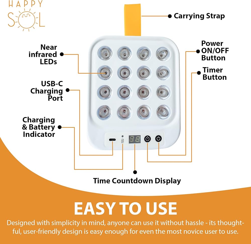 غير مشدود: يعد جهاز العلاج بالضوء الأحمر من هابي سول بلا ألم وسهل الاستخدام. لا يستخدم مواد كيميائية قاسية أو مواد سامة. فقط قم بتشغيل الضوء الأحمر واستخدامه حسب التعليمات.