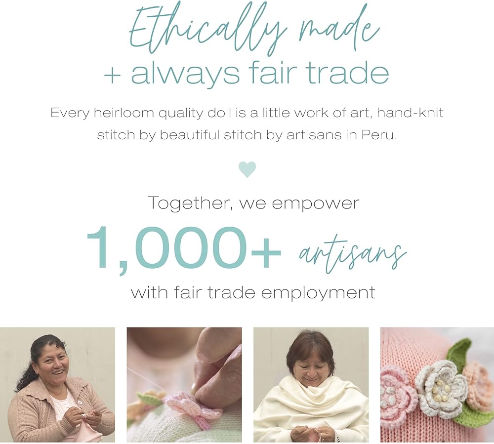 التجارة العادلة: تدعم شركة cuddle+kind أكثر من 1000 حرفي من خلال فرص عمل مستدامة ومنصفة وعادلة. نحن نضمن حصول الأمهات العاملات على ساعات عمل مرنة وأن يحصلن على أجور عادلة مقابل عملهن، مما يمكّنهن من رعاية أسرهن وتحسين مجتمعاتهن.