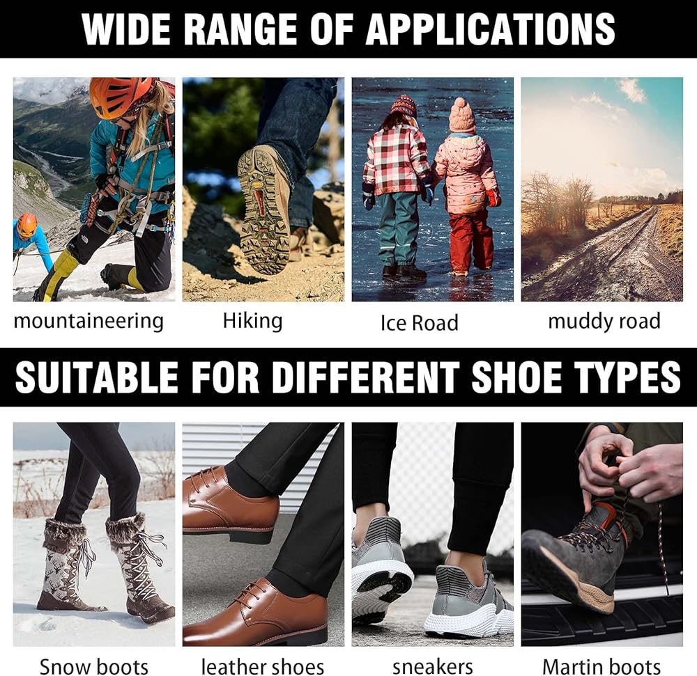 • WIDELY APPLICABLE: The universal crampons are suitable for most types of shoes, such as sports shoes, boots, casual shoes, etc. They can be used by men, women, and children of all ages. They are very suitable for winter outdoor activities such as shoveling snow, walking on snowy days, and ice fishing, ensuring your safety.