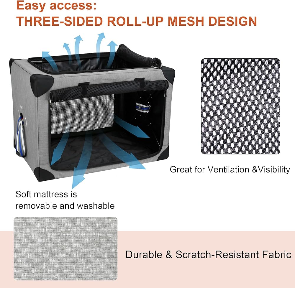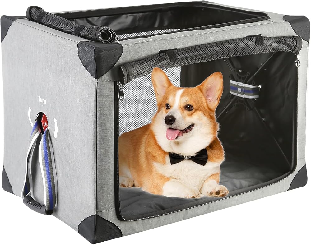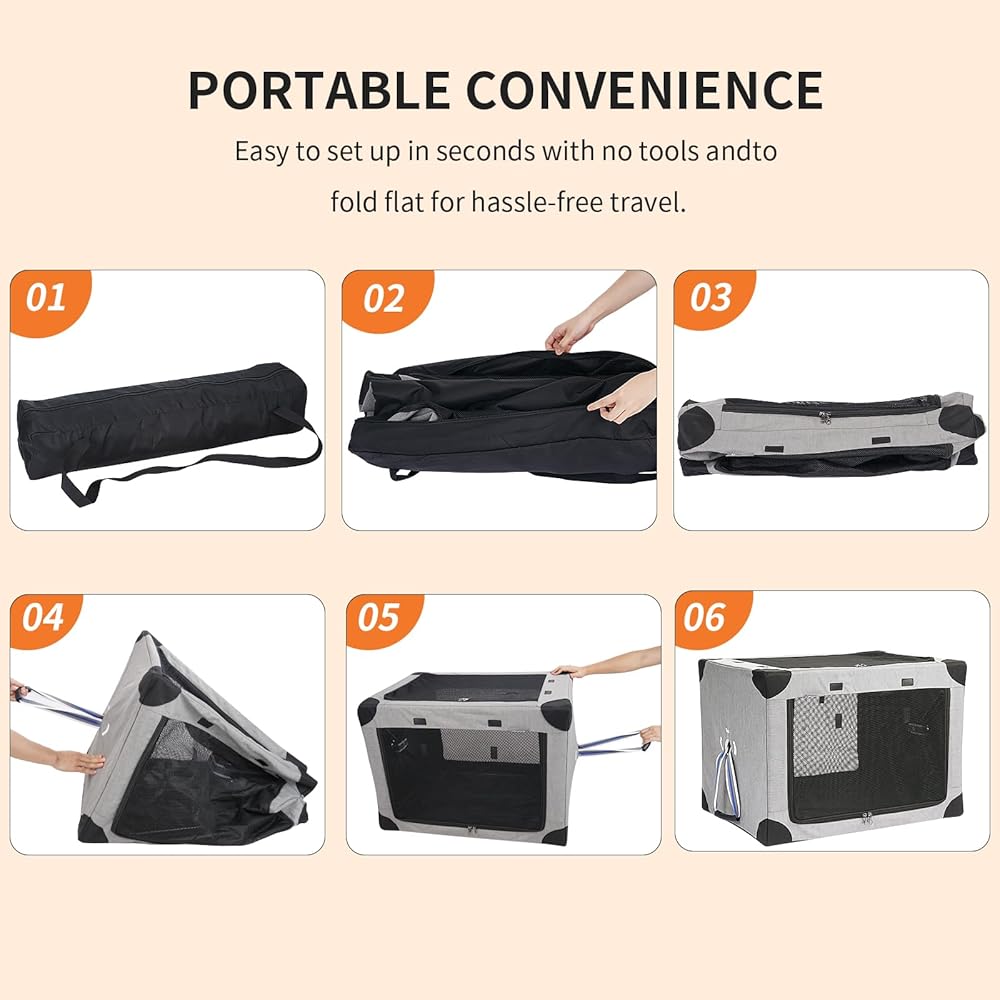 صناديق الكلاب الناعمة القابلة للطي من FLARUZIY - قفص سفر محمول للكلاب مقاس 26 بوصة للكلاب الصغيرة والقطط في الداخل والخارج، قفص للكلاب قابل للطي بثلاثة أبواب منبثق مع نوافذ شبكية متينة (رمادي)