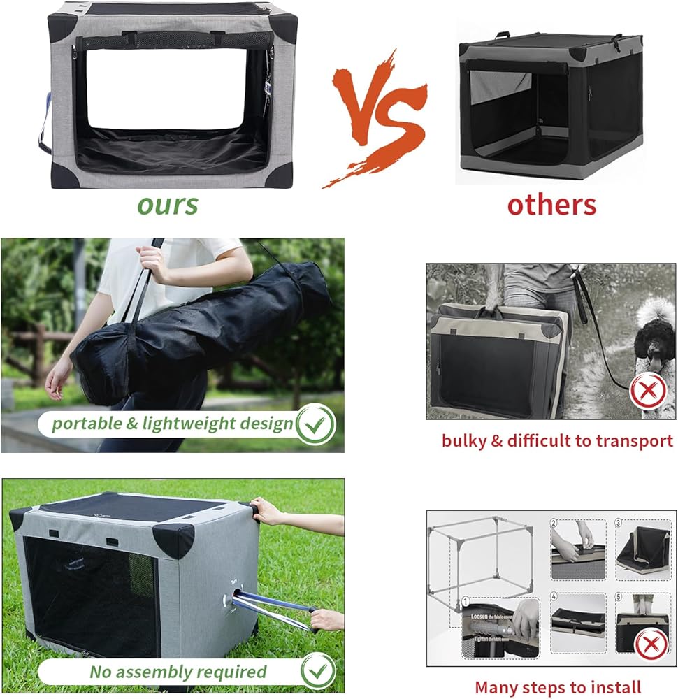 • سهل التجميع/التفكيك: صندوق الكلاب القابل للطي سهل التركيب والإرجاع في ثوانٍ! كل ما عليك فعله هو سحب المقابض الموجودة على الجانبين وسيفتح نفسه ويثبت في مكانه وهذا كل شيء! لطي الصندوق، عليك فقط إدارة المقابض الصغيرة على كل جانب (يمكن الوصول إليها فقط من خارج الصندوق) لفك الأقفال، مما يسمح لصندوق الكلاب الناعم بالانهيار مرة أخرى. إنه يجعل السفر ورحلات نهاية الأسبوع أسهل بكثير من حمل صندوق كبير.