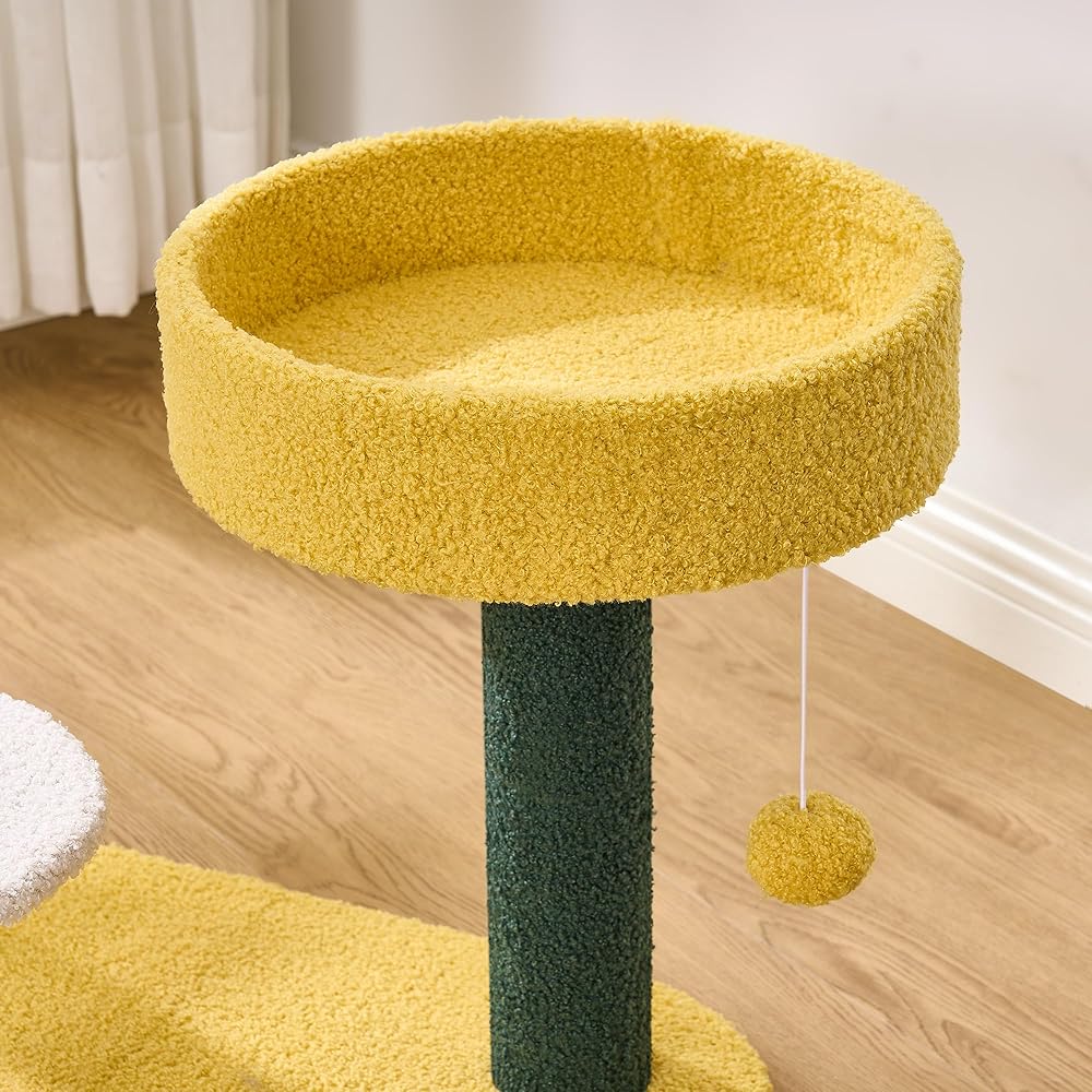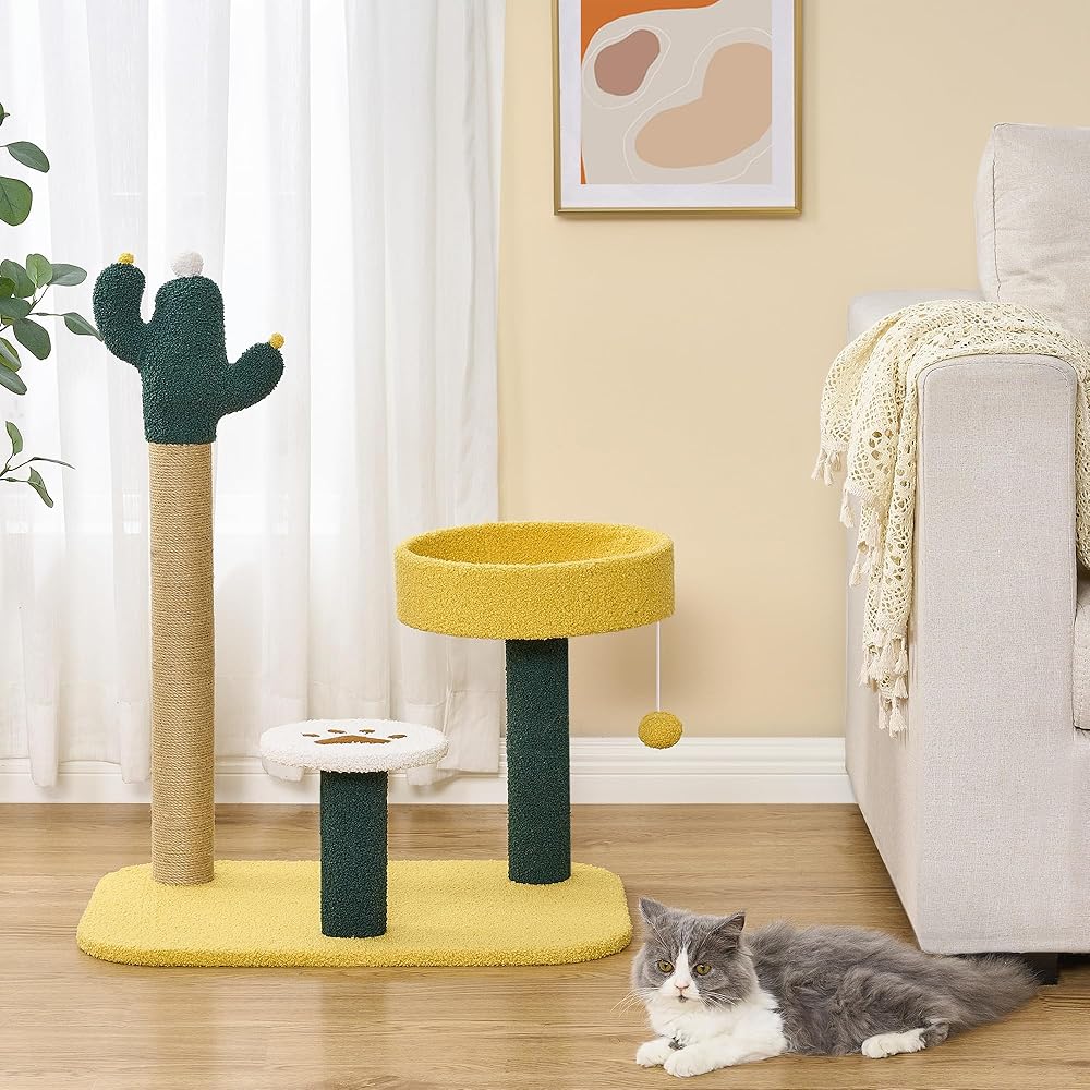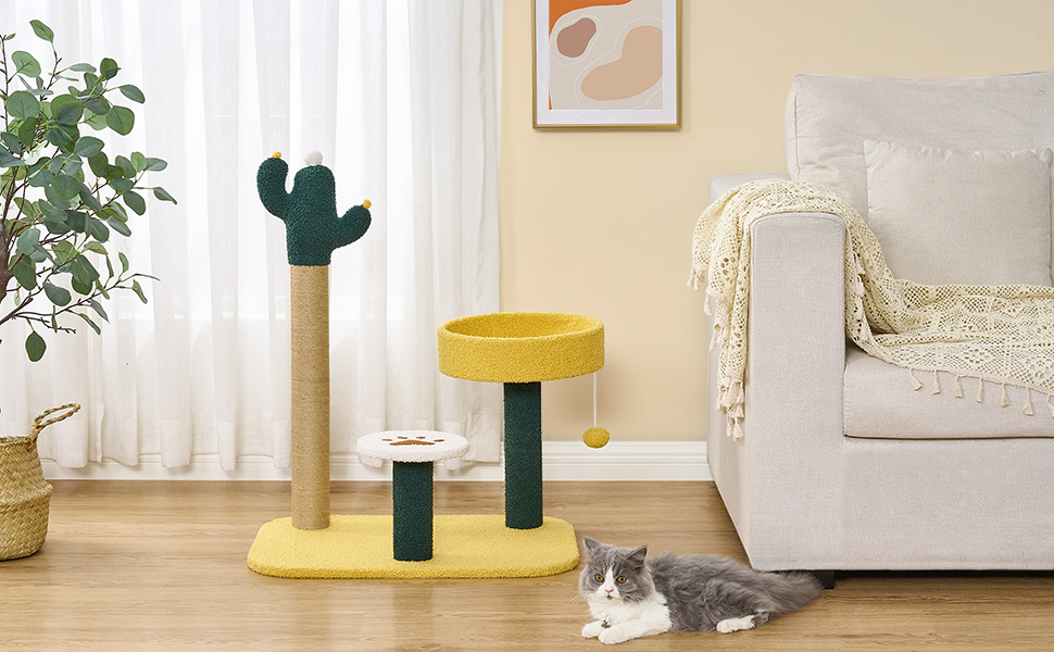 UNIQUE DESIGN AND COLOR MATCHING : This cactus cat tree designed with natural sisal, top bed for watching out of the window and climbing perch to jump up and down. The cute cat tower features green cactus combine with yellow carpet looks more colorful and vivid, which light up your home