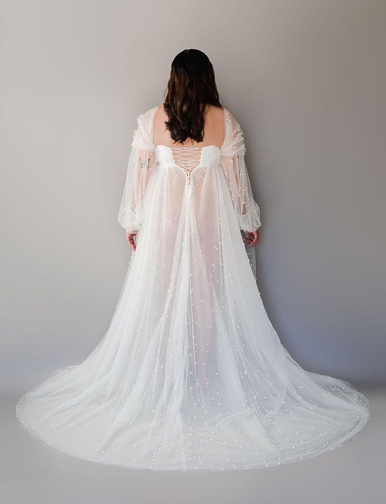【تصميم جميل/رائع】تصميم مناسب للأمهات مع خصر إمبراطوري، صدرية مبطنة بالكامل مع أكواب حمالة صدر لدعم أفضل، أكمام طويلة مجمعة بدون أكتاف مع أزرار لؤلؤية للإغلاق في النهاية، مشد خلفي قابل للتعديل لسهولة الارتداء، تنورة شفافة شفافة لالتقاط صور رومانسية فتحة مفتوحة في التنورة الوسطى لبطن طفلك.