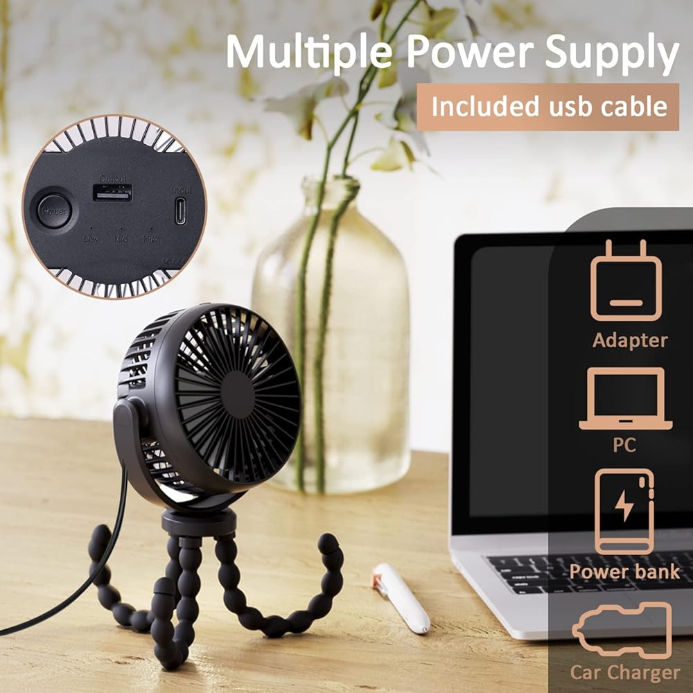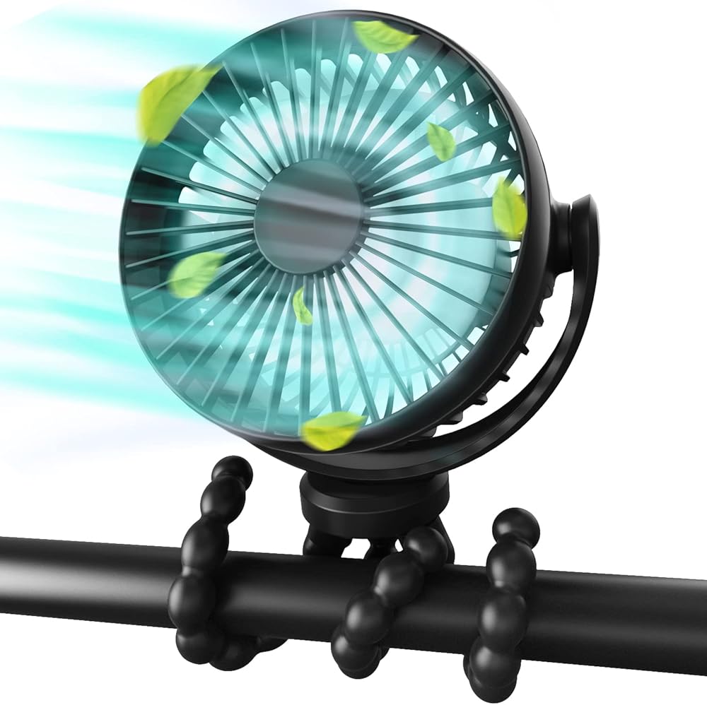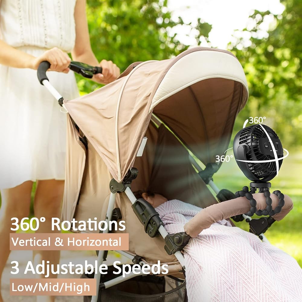 【Safety Comes First】The stroller fan's cover only has 5.5mm gaps, avoid the baby's little fingers from entering, and parents do not have to worry about the baby's safety. 【Long Endurance】Don't worry about running out of battery while you go out. Our battery operated stroller fan has a powerful 5200mAh battery with a long-lasting life of 10-32 hours. Get ready to enjoy stress-free outings with your baby, thanks to our amazing portable baby stroller fan. 【Powerful Wind & Quiet】Stroller fan clip on for baby 3 adjustable wind speeds, you can set wind soft, medium, strong breeze according to different needs. When you adjust to low or medium speed, the baby fan will not disturb your baby's sleep. 【Flexible Stable Tripod】This mini handheld stroller fan with lightweight design. The Stroller fan's Flexible Tripod is made of skin-friendly and safe silicone material that can be bent or folded on demand, and can be held tightly like an octopus claw in a variety of use scenarios, and can also be used as a mobile phone holder. 【Car Seat Fan】When you take your baby out in summer, the air-conditioning wind in the car is not suitable for baby. This portable stroller fan will be your ideal choice, that can be easily and stably mounted on your car seat and provide cool and quiet wind to your baby.