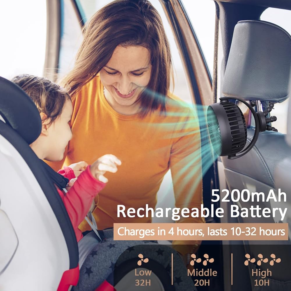 Car Seat Fan When you take your baby out in summer, the air-conditioning wind in the car is not suitable for baby. This portable stroller fan will be your ideal choice, that can be easily and stably mounted on your car seat and provide cool and quiet wind to your baby.