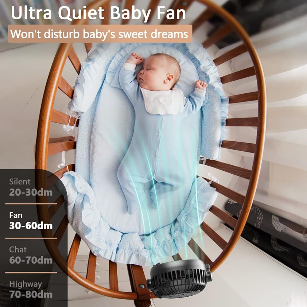 Powerful Wind & Quiet Stroller fan clip on for baby 3 adjustable wind speeds, you can set wind soft, medium, strong breeze according to different needs. When you adjust to low or medium speed, the baby fan will not disturb your baby's sleep.