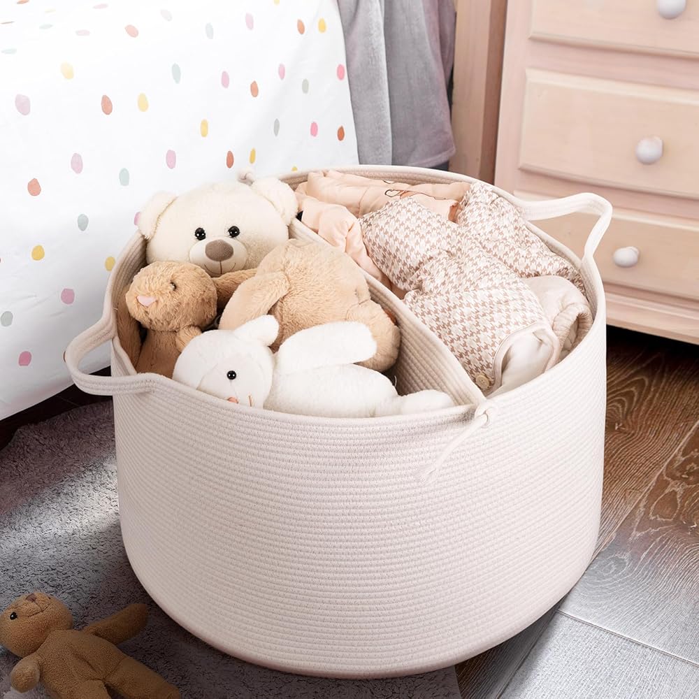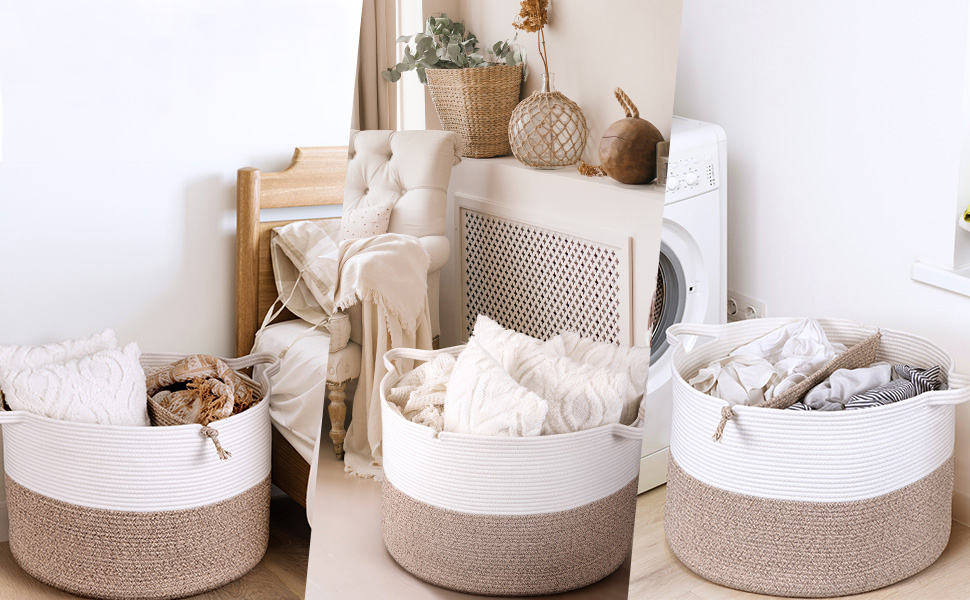 سلة من الحبال ناعمة الملمس: السلال المنسوجة مصنوعة من القطن، خالية من الروائح. صندوق تخزين اللعبة ليس به حواف حادة أو صلبة، وهو أكثر ملاءمة لألعاب طفلك وملابسه وبطانياته وتخزين أغراض الحيوانات. سلة الحبال أكثر أمانًا ومتانة من السلة البلاستيكية أو القماشية