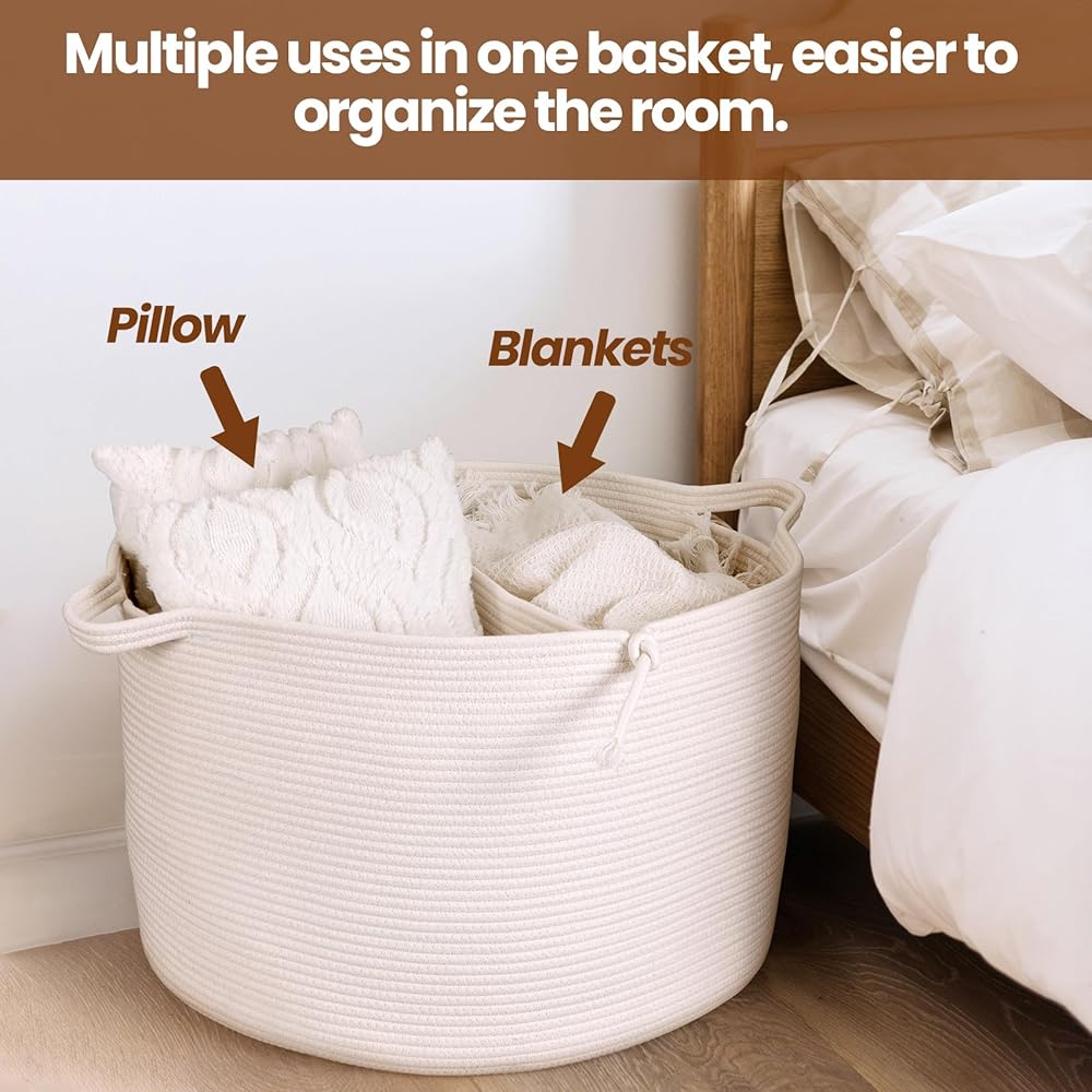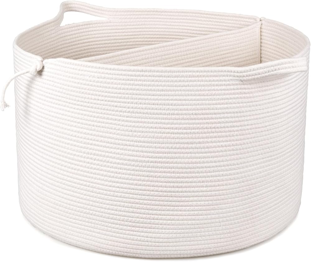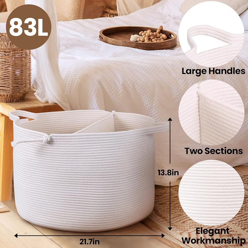 سلة تخزين منسوجة سعة 83 لترًا: 21.7 × 21.7 × 13.8 بوصة. سعة كبيرة تجعلها حلاً تنظيميًا رائعًا لغرفة الغسيل الخاصة بك، يمكن لصندوق التخزين الكبير جدًا هذا أن يلبي احتياجات عائلتك من الملابس المتسخة. ستبقي سلة الملابس هذه منزلك مرتبًا ونظيفًا بسهولة