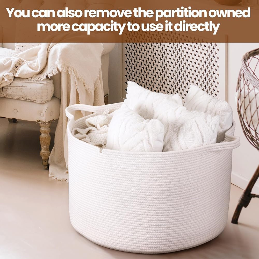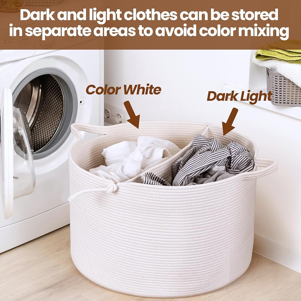 صندوق تخزين مكون من قسمين: يمكن للسلة استخدام المساحة في المنزل بشكل أفضل، واستخدامات تخزين مضاعفة للألعاب القطيفة، والحيوانات القطيفة، والبطانيات، والوسائد، ومستلزمات الأطفال، والغسيل، وحتى ألعاب الكلاب. يمكن لتصميم القسمين فصل الملابس ذات الألوان الداكنة أو الفاتحة بشكل فعال