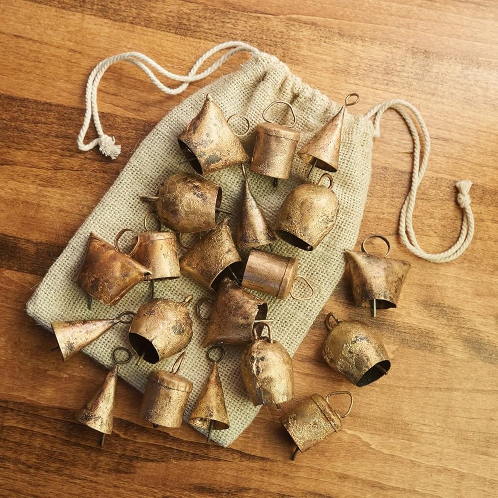 20 جرس نوح - مصنوعة يدويًا في الهند وفقًا للتقاليد والممارسات القديمة، تصل هذه المجموعة المكونة من 20 جرس نوح في حقيبة صغيرة من الخيش. يُعرف أيضًا باسم أجراس هارموني أو أجراس المعبد، ويقال إن أجراس نوح تمنع الشر وتساعد في المساعي الروحية والتأمل. يمكنك تعليقها في مجموعات على أبوابك لتحية الضيوف، أو ربطها معًا لصنع أجراس الرياح الخاصة بك، أو حتى استخدامها كزينة هدايا فريدة من نوعها. تصل الأجراس الحديدية المصنوعة يدويًا كمجموعة من 20: 5 لكل من 4 أشكال مختلفة. حقيبة الأجراس هذه هي هدية رائعة لأي شخص يحب الهدايا الروحية أو الحرفيين الذين يبحثون عن عنصر فريد لإضافته إلى إبداعاتهم. يبلغ قياس الأجراس حوالي 1 1/2 انش لكل منها.