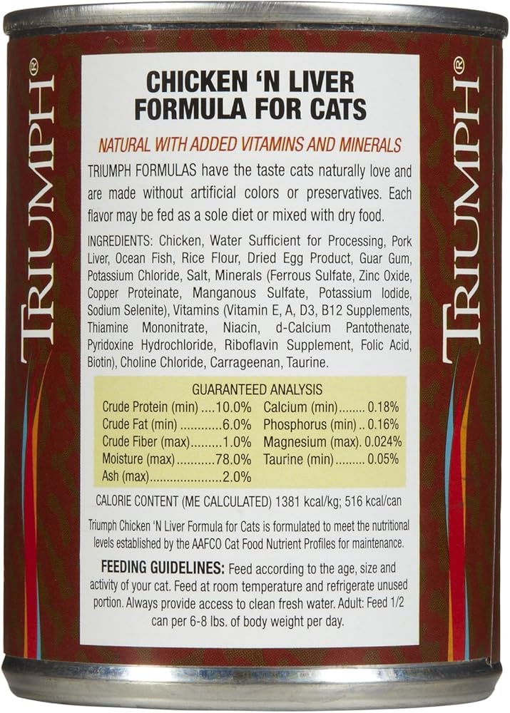 Triumph Cat Formulas consist of premium natural products, wholesome proteins and natural fats and carbohydrates. Plus, they have a premium flavor cats love! Each formula may be fed as a sole diet or mixed with dry food.