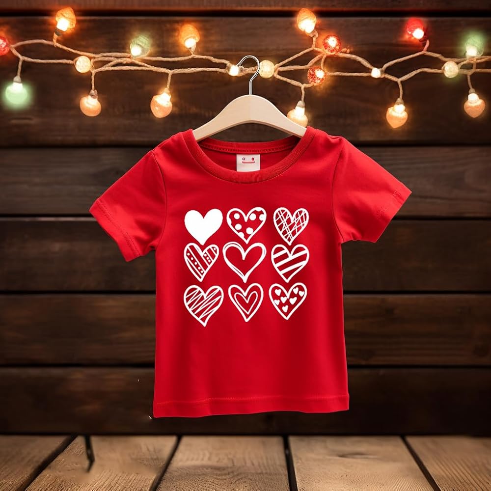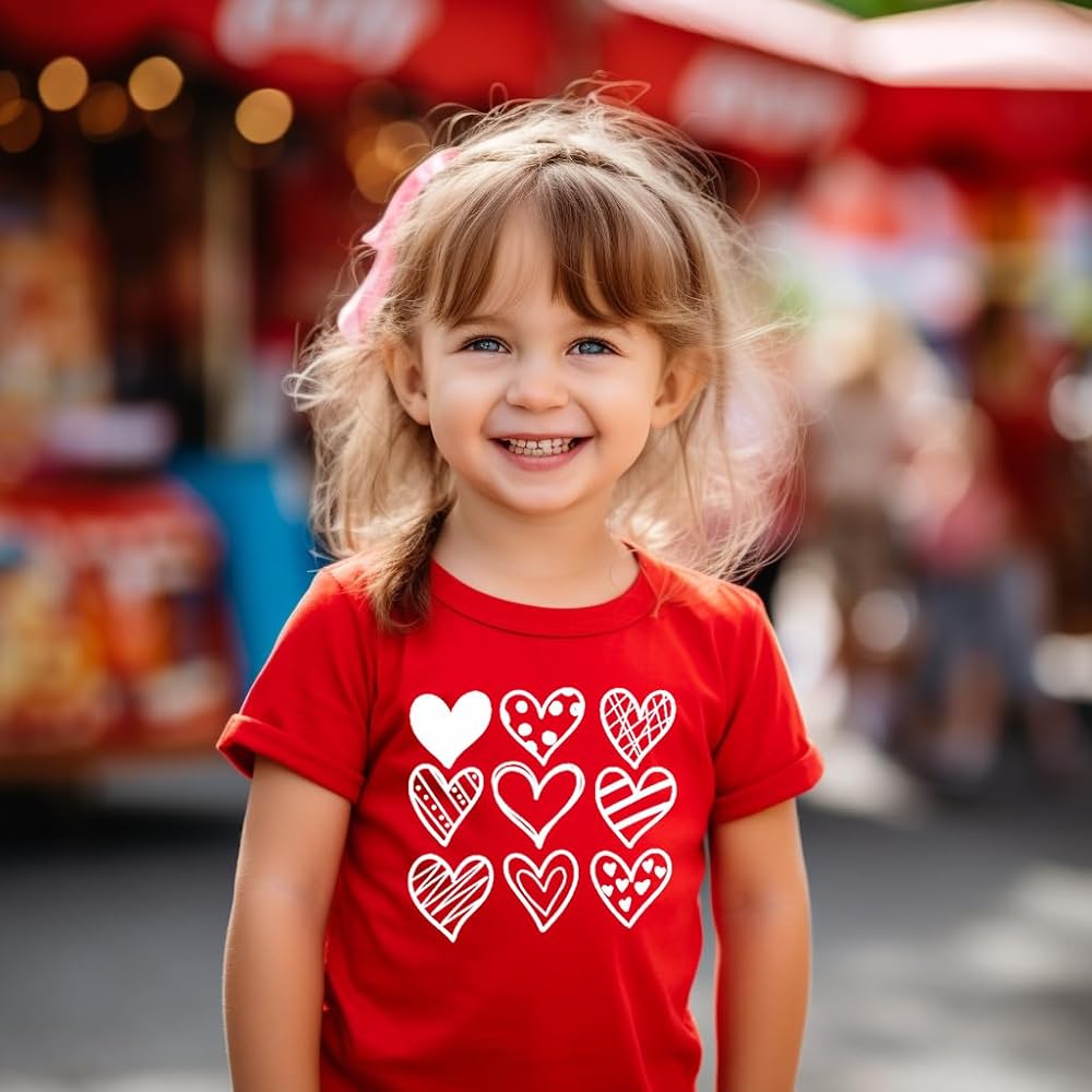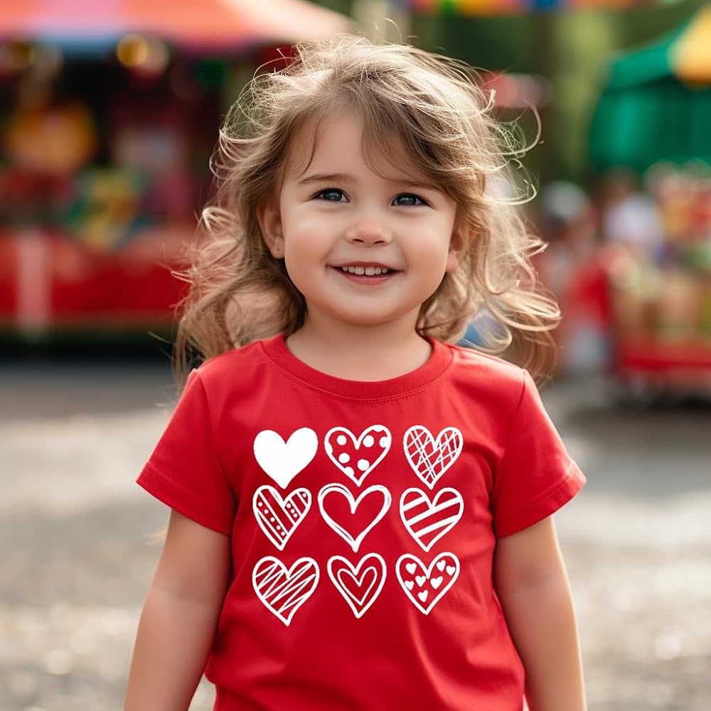 [تي شيرت ناعم لعيد الحب] قميص عيد الحب للأطفال الصغار هذا مصنوع من مزيج القطن ومريح في الارتداء. بلوزة قصيرة الأكمام برسومات قلب لطيفة. قمصان عيد الحب للفتيات لدينا ستجعل طفلتك تشعر بالراحة طوال اليوم، وتستمتع بلمسة عيد الحب الناعمة. القطن جيد التهوية على بشرتك، ويحافظ على كل شيء منتعشًا وجافًا.