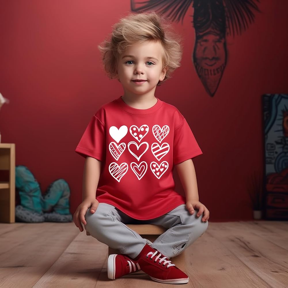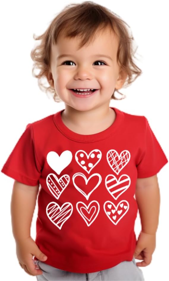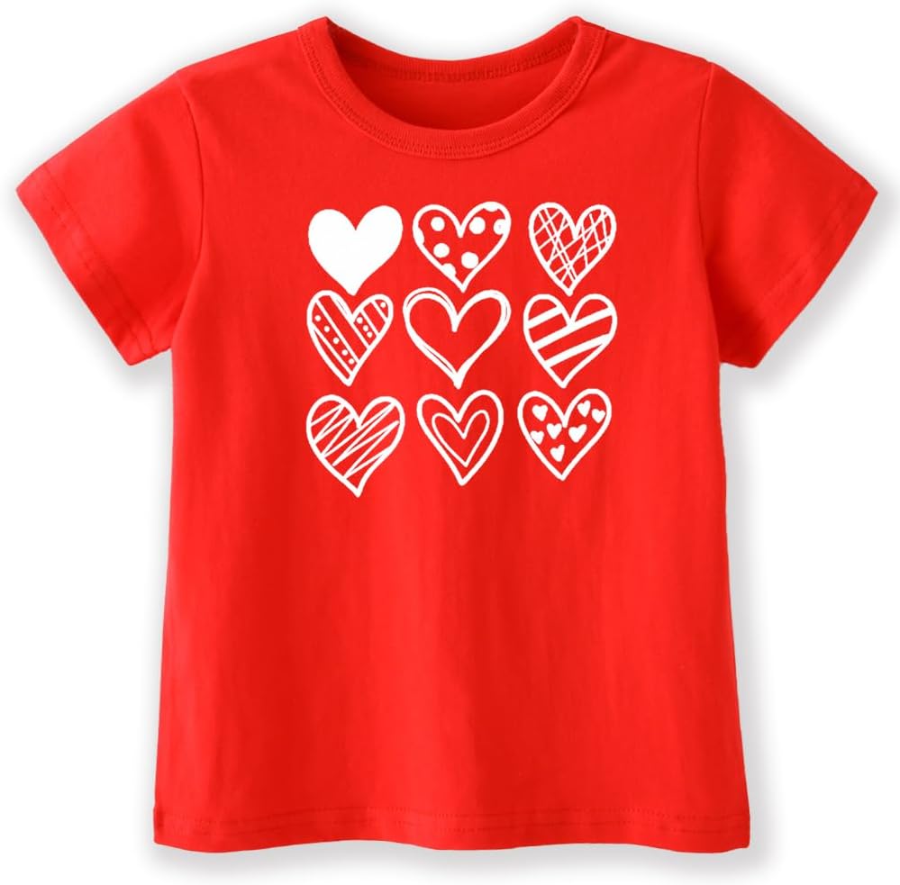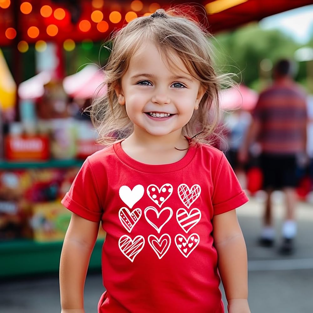 [تي شيرت ناعم لعيد الحب] قميص عيد الحب للأطفال الصغار هذا مصنوع من مزيج القطن ومريح في الارتداء. بلوزة قصيرة الأكمام برسومات قلب لطيفة. قمصان عيد الحب للفتيات لدينا ستجعل طفلتك تشعر بالراحة طوال اليوم، وتستمتع بلمسة عيد الحب الناعمة. القطن جيد التهوية على بشرتك، ويحافظ على كل شيء منتعشًا وجافًا.