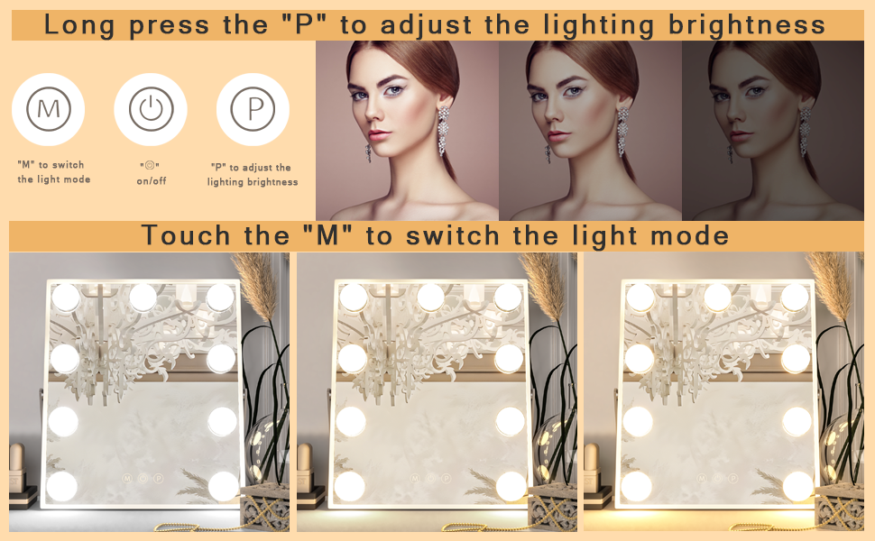 ✨سطوع قابل للتعديل وأضواء 3 ألوان: من السهل التشغيل باستخدام شاشة اللمس الذكية، زر "M" لتغيير لون الضوء، زر "P" لضبط السطوع. حرية تبديل 3 أوضاع (طبيعي، بارد، ودافئ). سطوع قابل للتعديل يلبي متطلبات الماكياج الشخصية الخاصة بك
