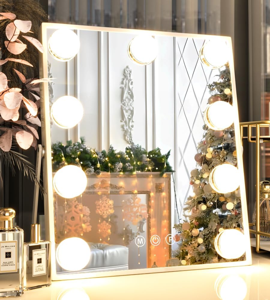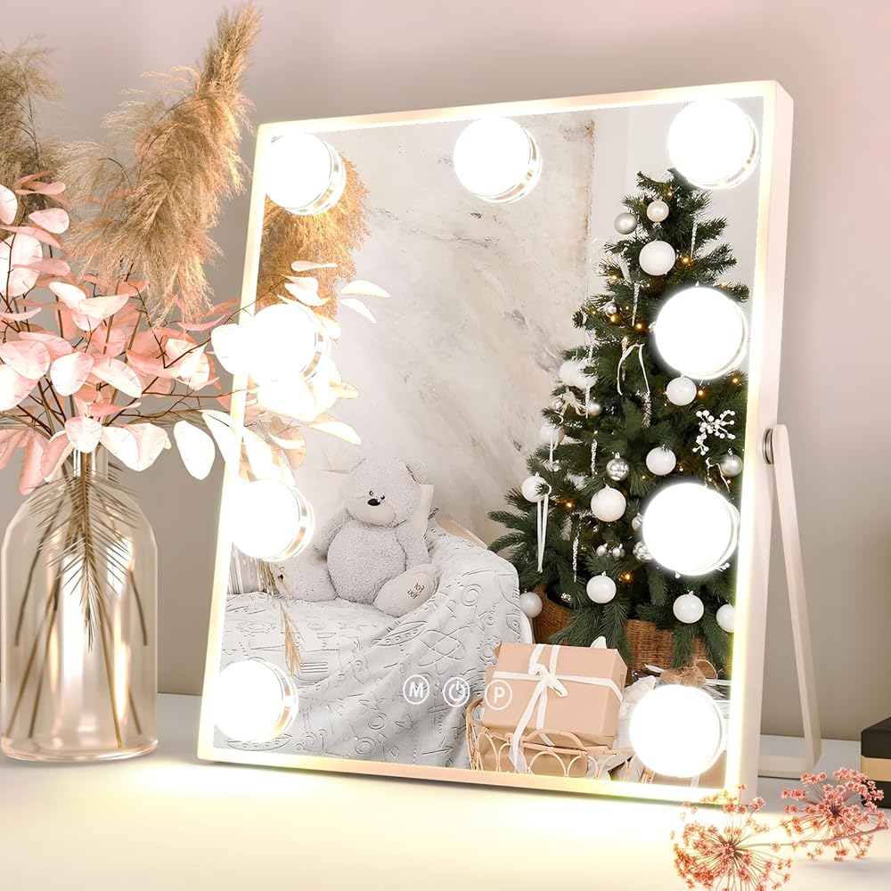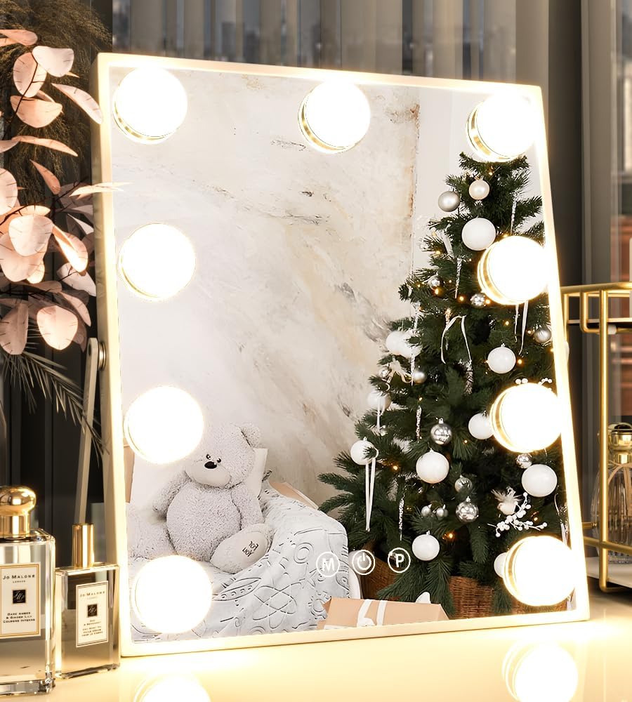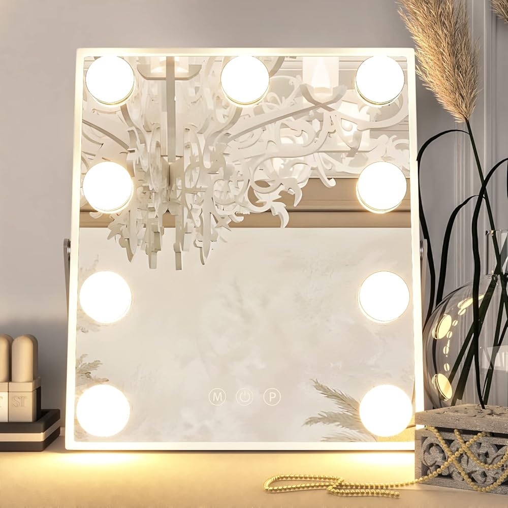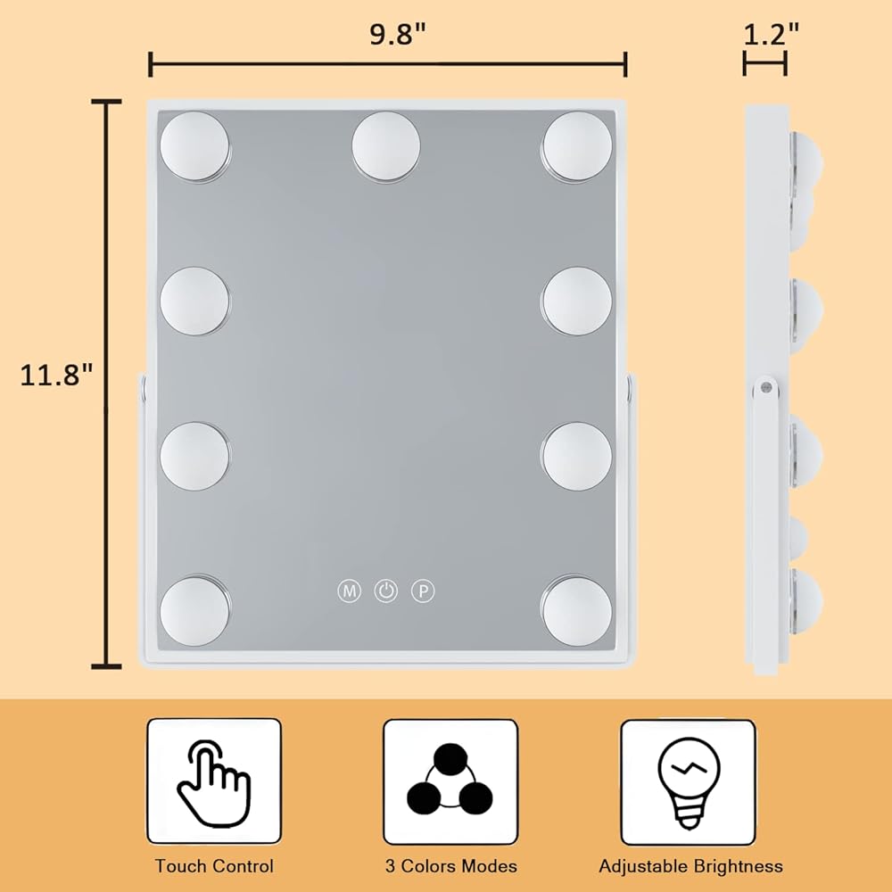 ✨ قم بإضاءة طاولة المكياج الخاصة بك: تتميز مرآة مكياج هوليوود هذه المزودة بـ 9 مصابيح LED بحجم مثالي (9.8 بوصة × 11.8 بوصة) رائعة لمكياجك الاحترافي، أو إظهار جمالك، أو ملابسك اليومية أو مكياج رائع تمامًا.