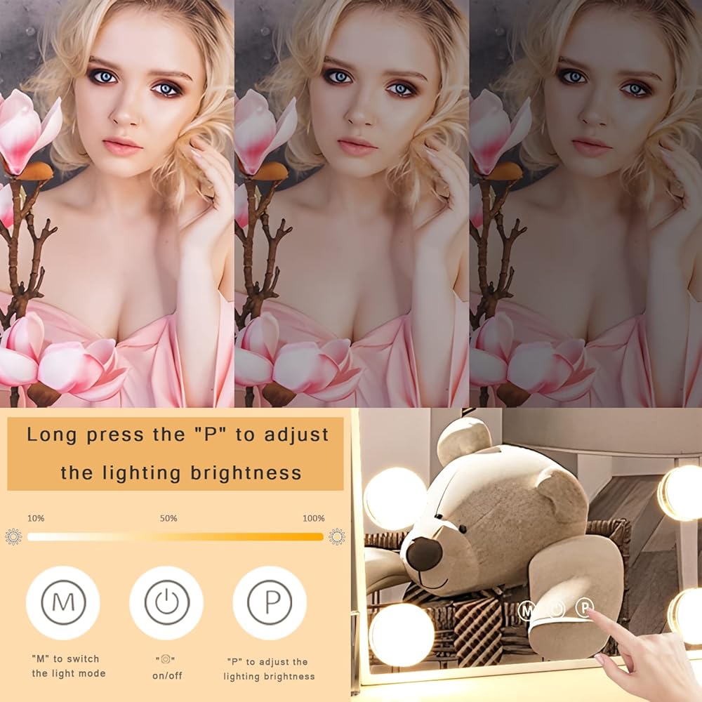✨مرآة إضاءة سطح الطاولة: مرآة هوليوود المضيئة بقاعدة ثابتة على شكل حرف U تسمح لك بضبط المرآة بحرية على الوضع الأمثل لزاوية رؤية المكياج أو العناية بالبشرة. إنها أفضل زخرفة لغرفة الفتيات.