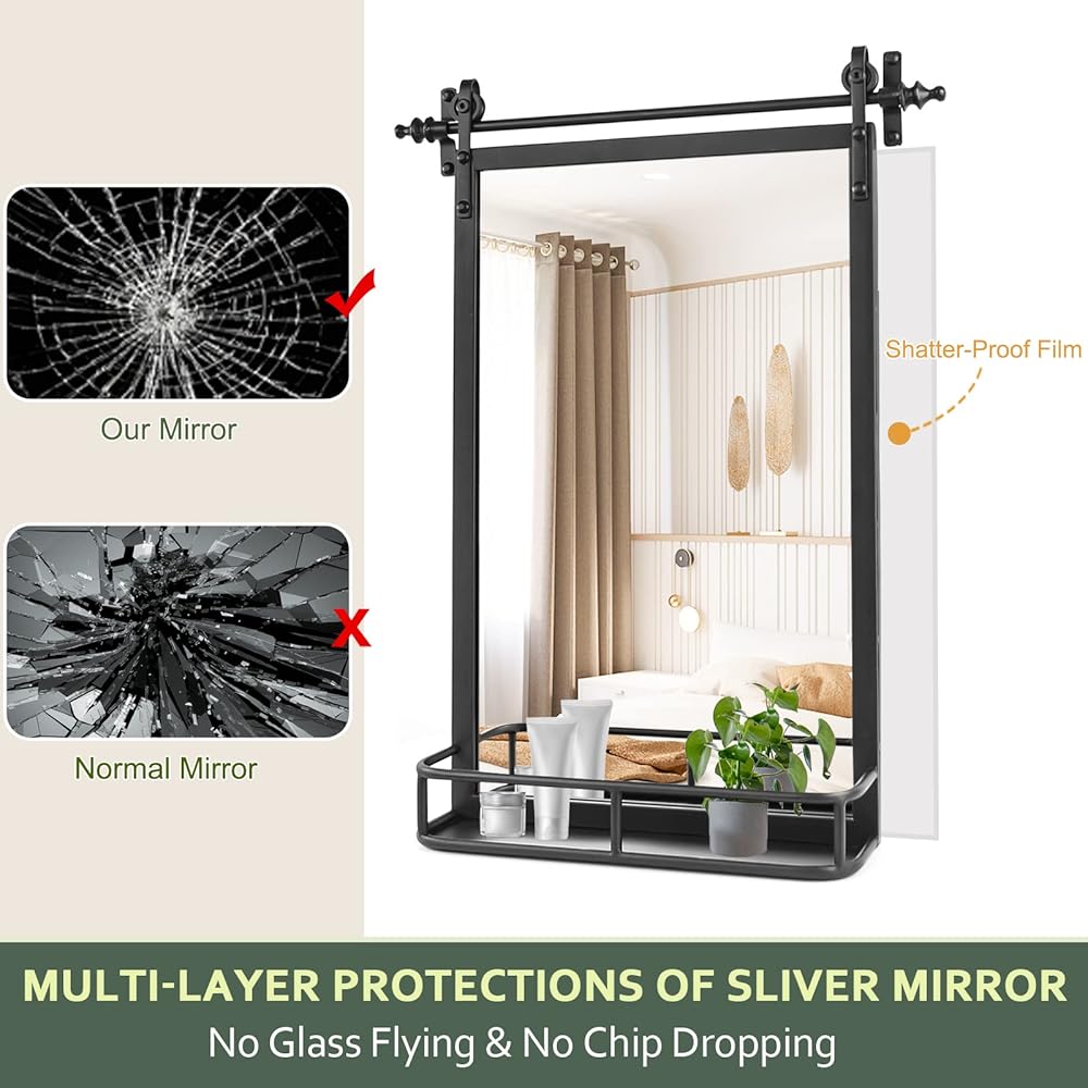 • هيكل عملي متعدد الطبقات: يتميز بإطار حديدي أسود مع تصميم مستوحى من باب الحظيرة، ومتانة طويلة الأمد وأنيقة؛ دعم ممتاز من MDF لمنع التآكل في البيئات الرطبة؛ يعتبر الفيلم المقاوم للكسر هو الطبقة المهمة للحفاظ على سلامة الأشخاص بمجرد اصطدام المرآة. توفر الطبقة المطلية بالفضة الممتازة انعكاسًا عالي الدقة دون أي تشويه على المرآة.