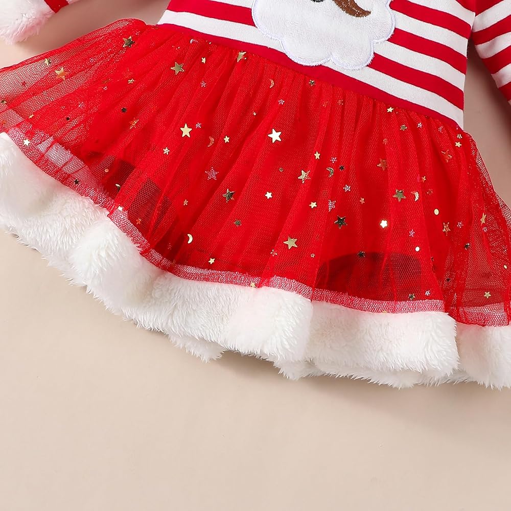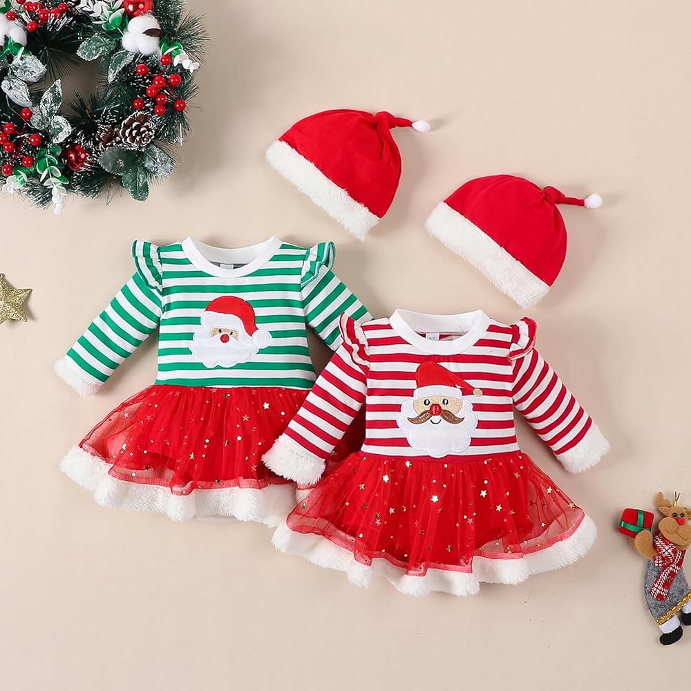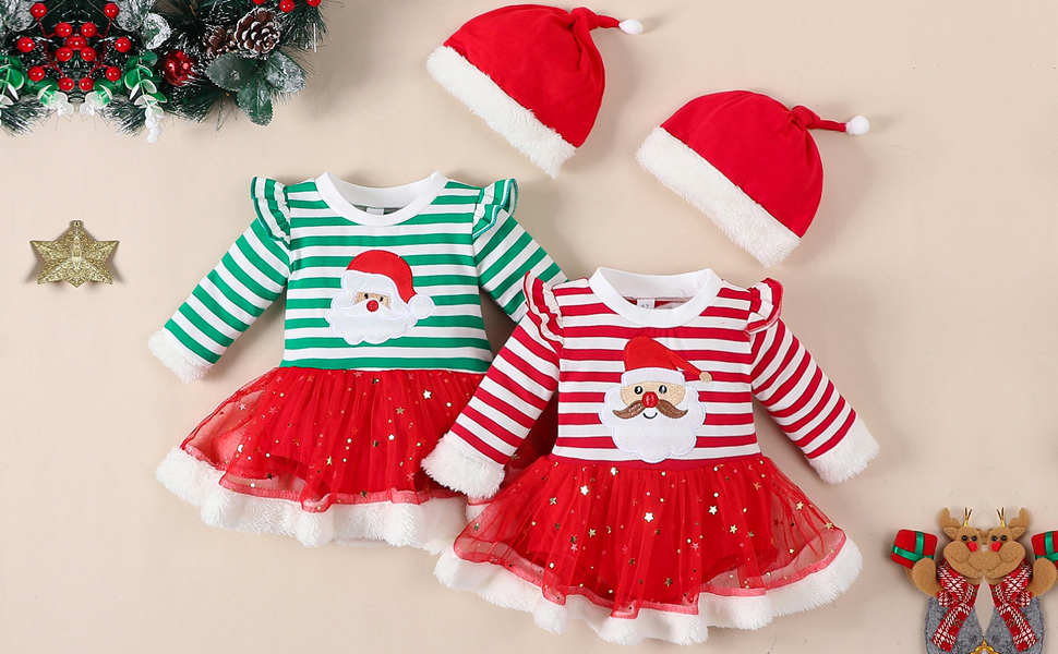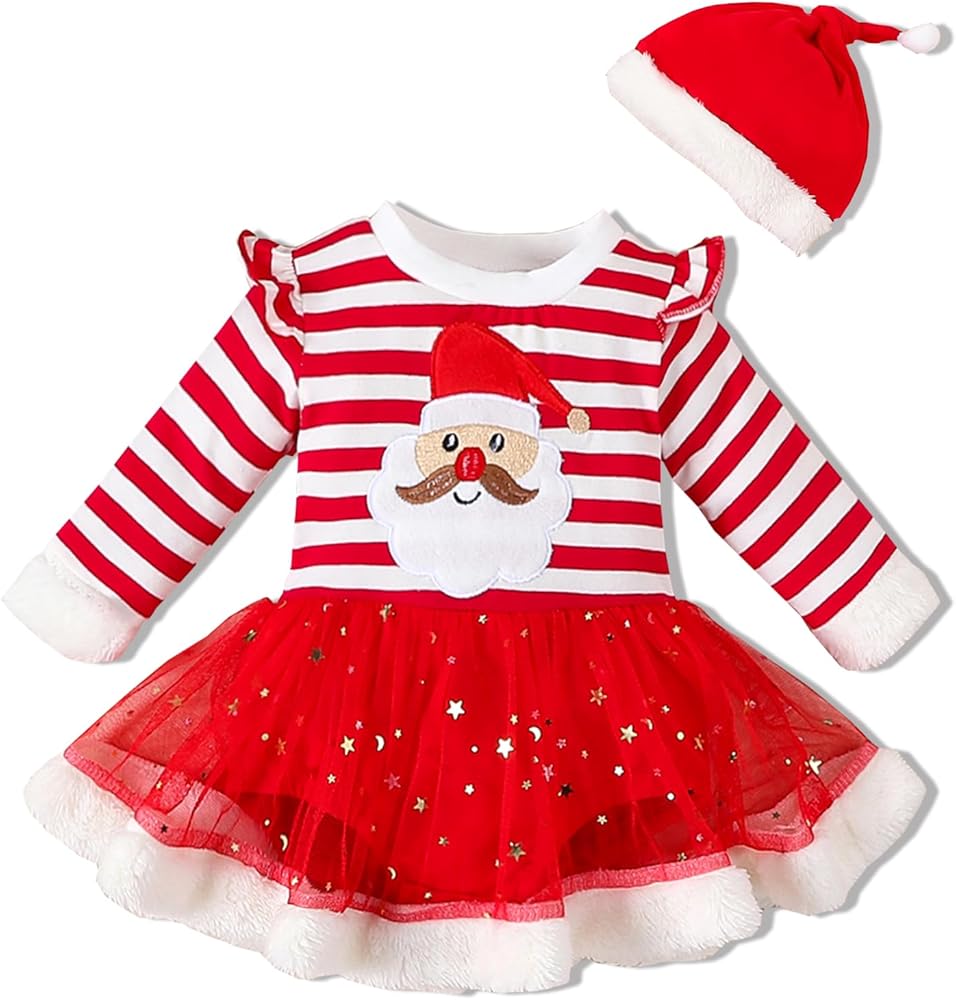 🎅التصميم: فستان عيد الميلاد، كم طويل، رقبة دائرية، نمط سانتا كلوز مطرز، قمصان علوية مخططة، حاشية من التل بالترتر، إغلاق بالإطباق، سهل الارتداء والخلع وتغيير الحفاضات. قبعة سانتا رائعة، مناسبة للارتداء في عيد الميلاد.