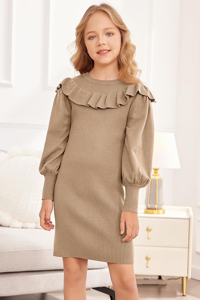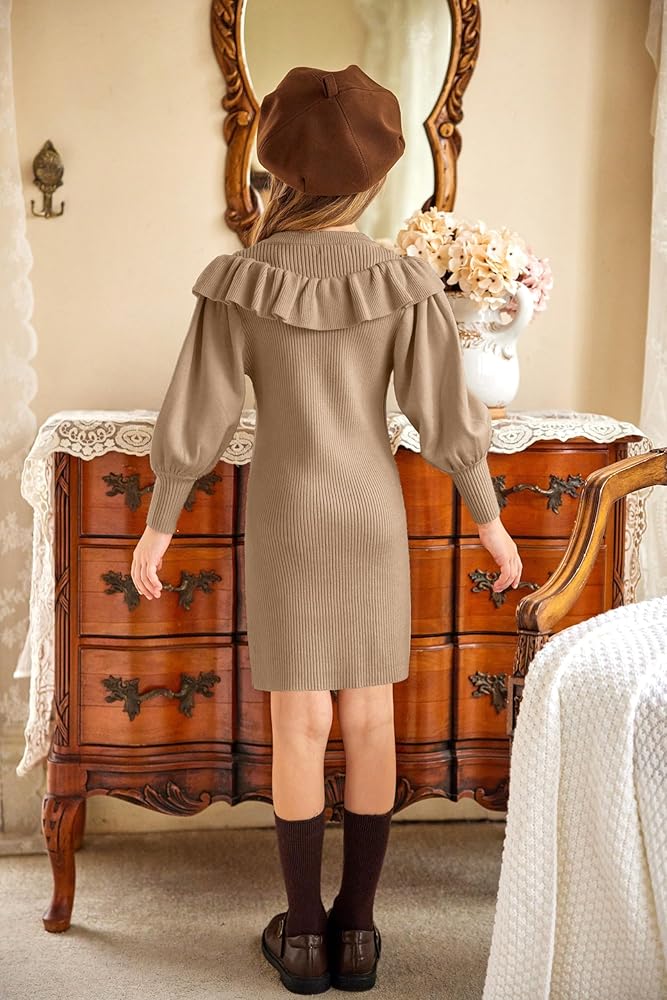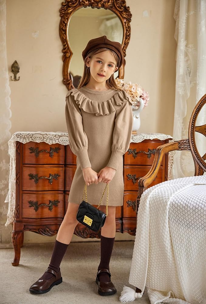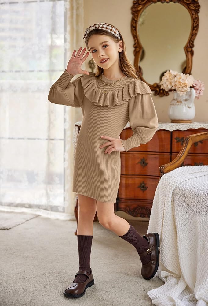 🎈بسيط ومبتكر: فستان محبوك لطيف للفتيات، يتميز برقبة دائرية، وزخرفة مكشكشة، ولون ثابت، وأكمام طويلة واسعة مع أساور ضيقة، وتصميم عصري أنيق. سيمنح فتياتك الجميلات شعورًا أنيقًا لطيفًا.