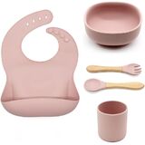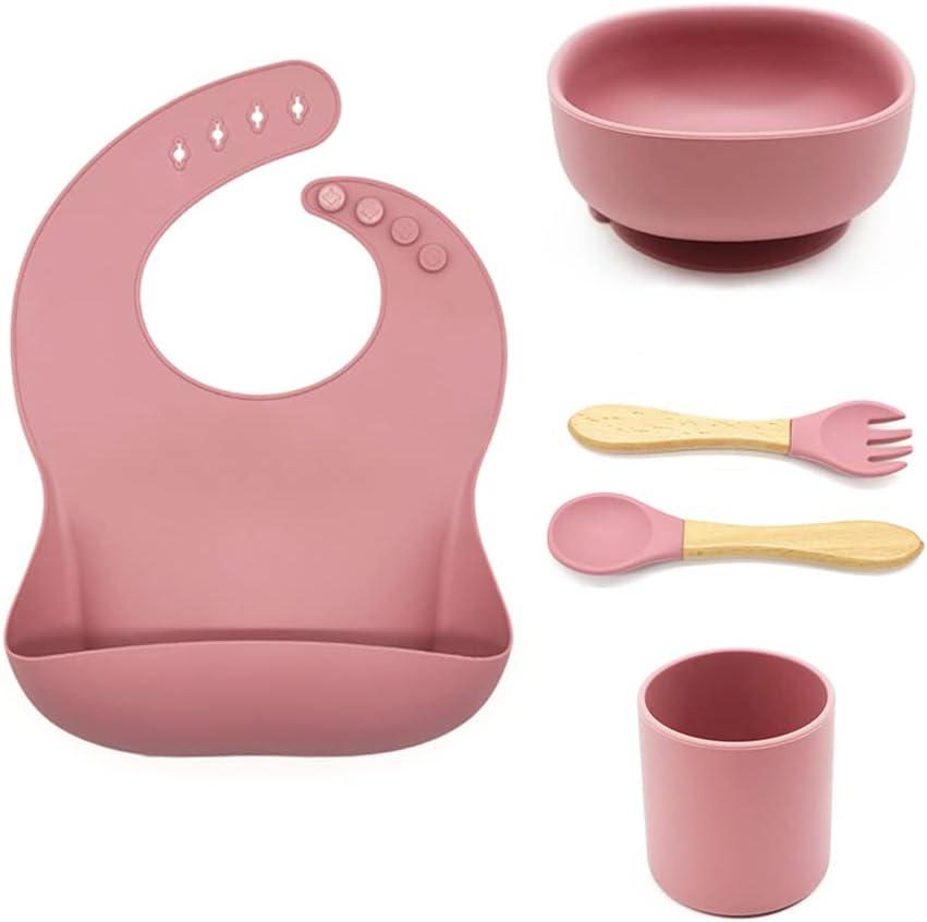 مجموعة تغذية الأطفال المكونة من 5 قطع من أطباق العشاء وأدوات المائدة المصنوعة من السيليكون، أوعية فطام الأطفال من سانتي آند مي مع شفط ومرايل سيليكون وملعقة وشوكة وأكواب للأطفال الصغار (وردي داكن)