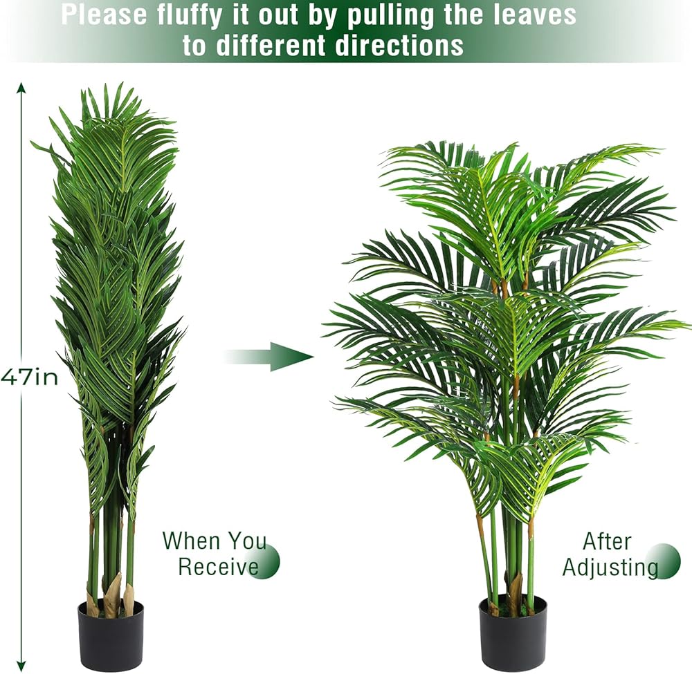 حول الارتفاع: يبلغ طول شجرة نخيل الأريكا الاصطناعية هذه 4 أقدام/47 بوصة/120 سم من أسفل الوعاء إلى أعلى الشجرة عند إخراجها من صندوق الشحن بينما تكون الأوراق في حالة مستقيمة. أي طرق ضبط مثل ثني جذعها وأوراقها ستجعل ارتفاعها يبدو أقل من 4 أقدام/47 بوصة/120 سم. يرجى أن تكون على علم قبل الشراء. في حالة وجود أي مشاكل بخصوص هذا النبات الاصطناعي، يرجى الاتصال بنا في أي وقت.