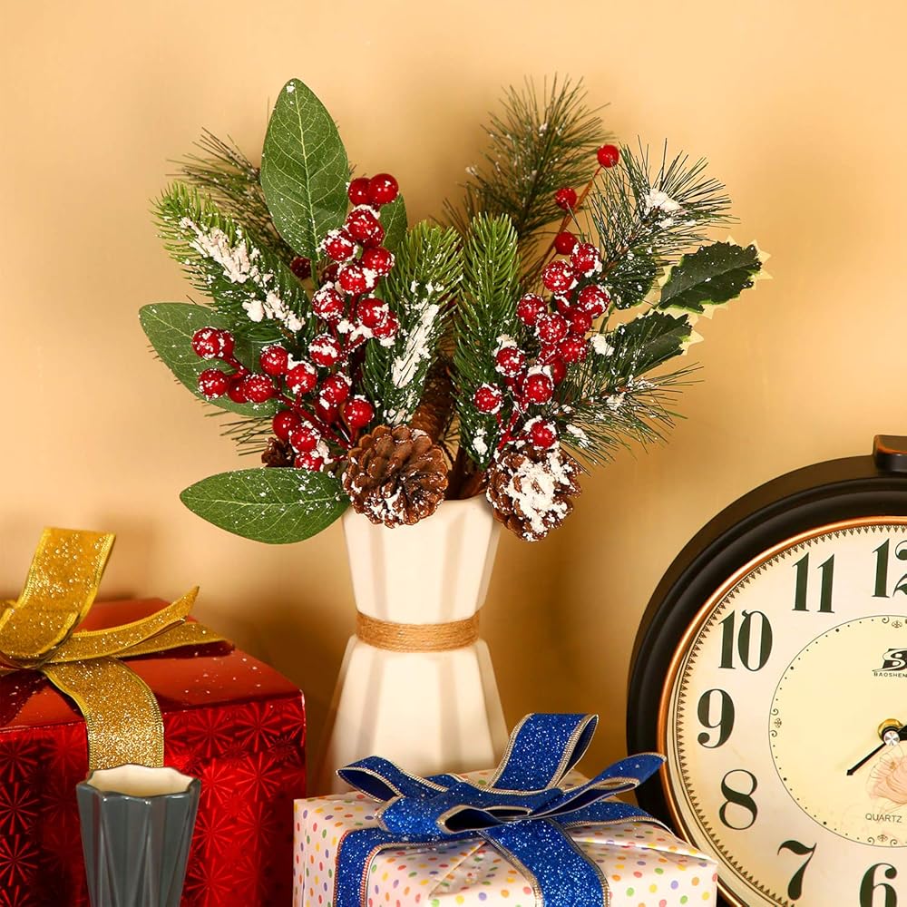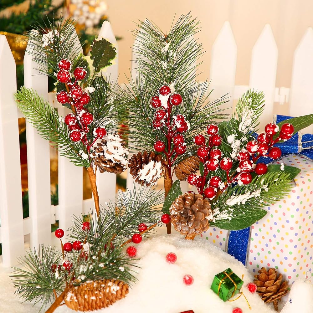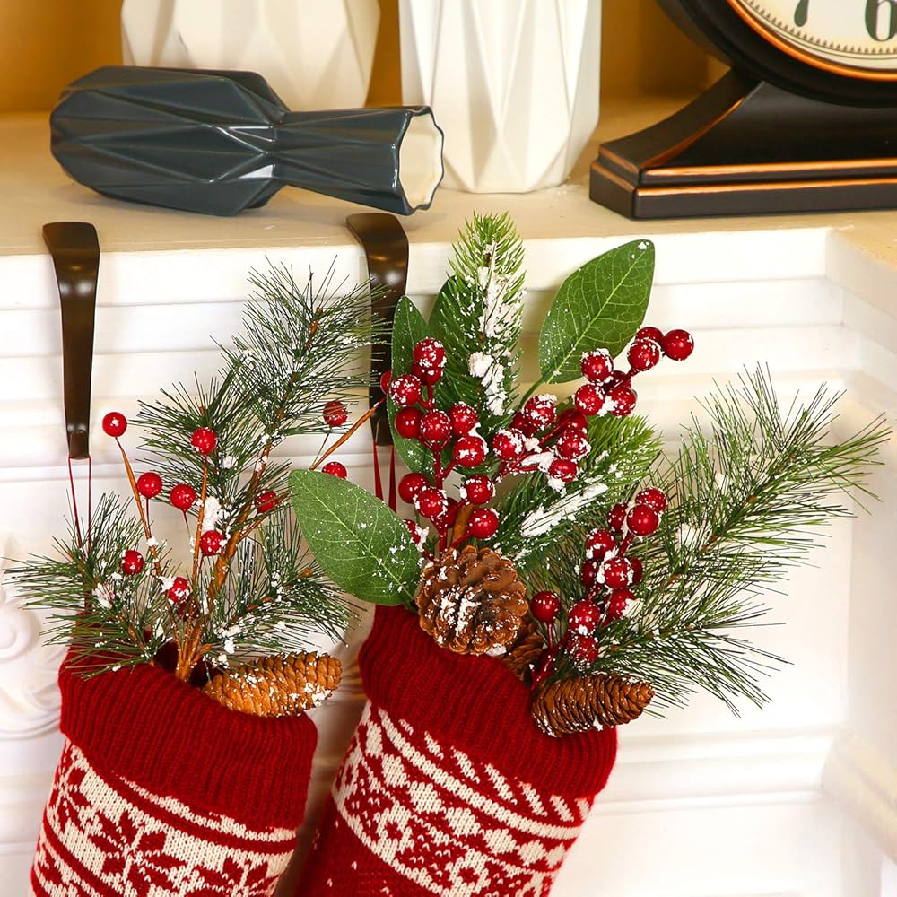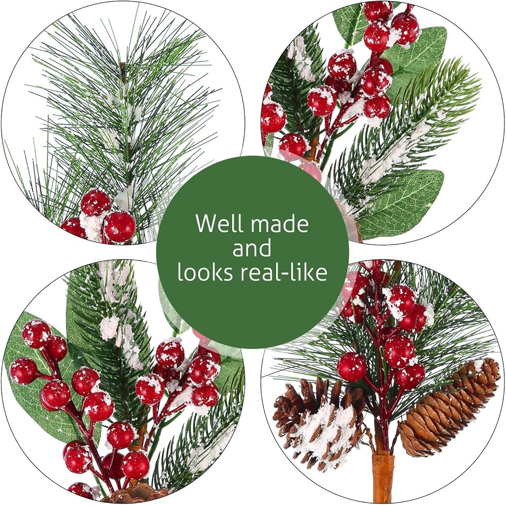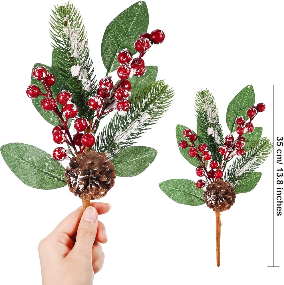 Artificial pine tree branches Christmas pin picks 13.8 inches with pine cones red berry flower ornaments in 6 styles for Xmas wreaths home vase decor
