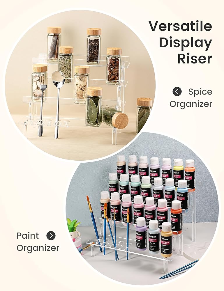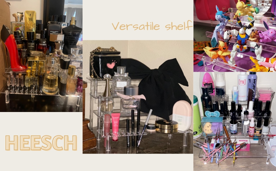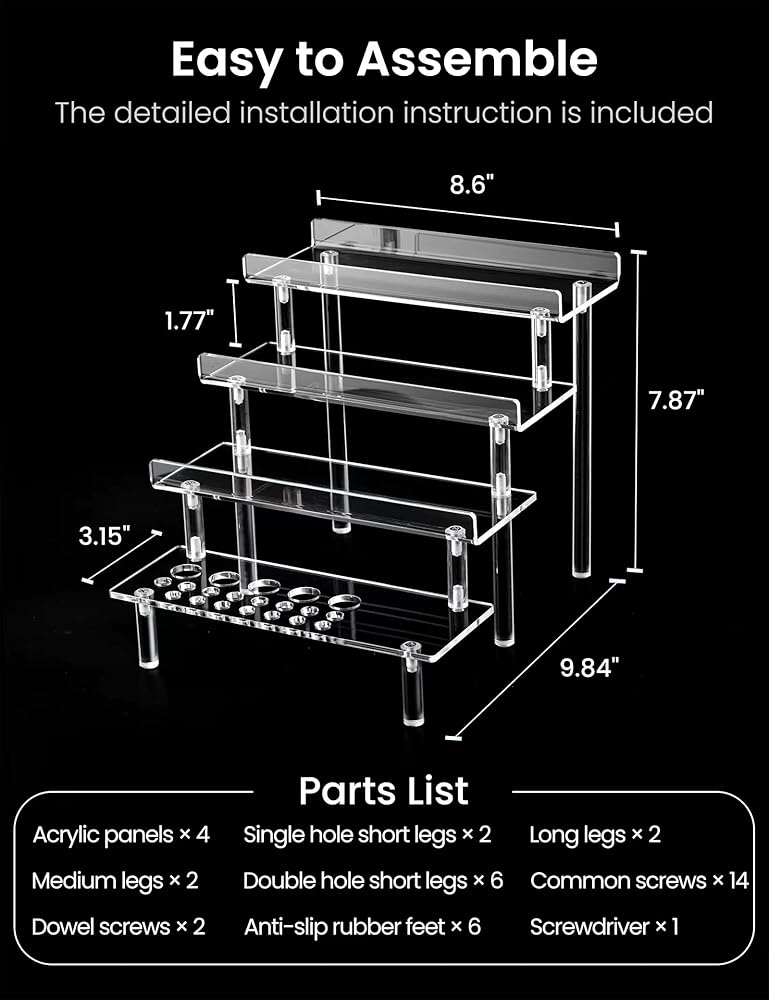 متعددة الاستخدامات وعملية: مثالية لتخزين العطور على الخزانات، وعرض شخصيات الحركة في الخزانات، وعرض المنتجات في متاجر البيع بالتجزئة، وما إلى ذلك. ويمكن استخدامها أيضًا كمنظم لمستحضرات التجميل/العناية بالبشرة، أو رف توابل، أو حامل طلاء الأظافر، أو حامل طلاء، أو حامل كب كيك، إلخ.