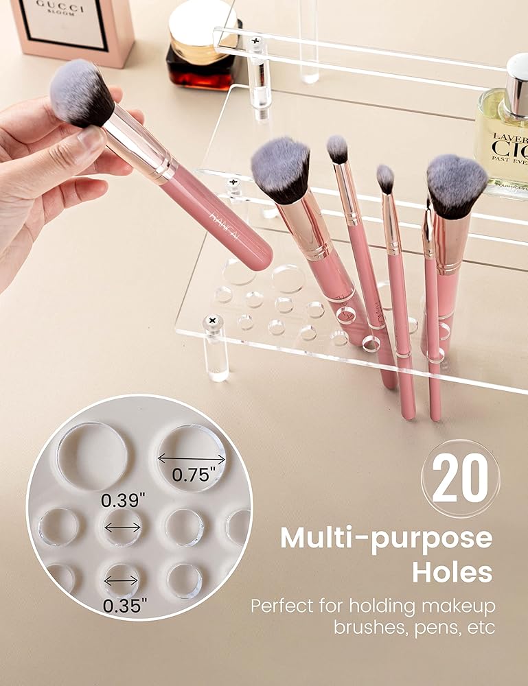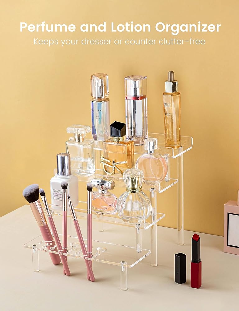 فتحات تخزين متعددة الأغراض: تتميز لوحة الأكريليك الأولى بثلاثة صفوف من الفتحات متعددة الأحجام لتخزين فرش المكياج والأقلام وعينات العطور وما إلى ذلك. حافظ على خزانة ملابسك خالية من الفوضى مع حامل العطور الأكريليك هذا.