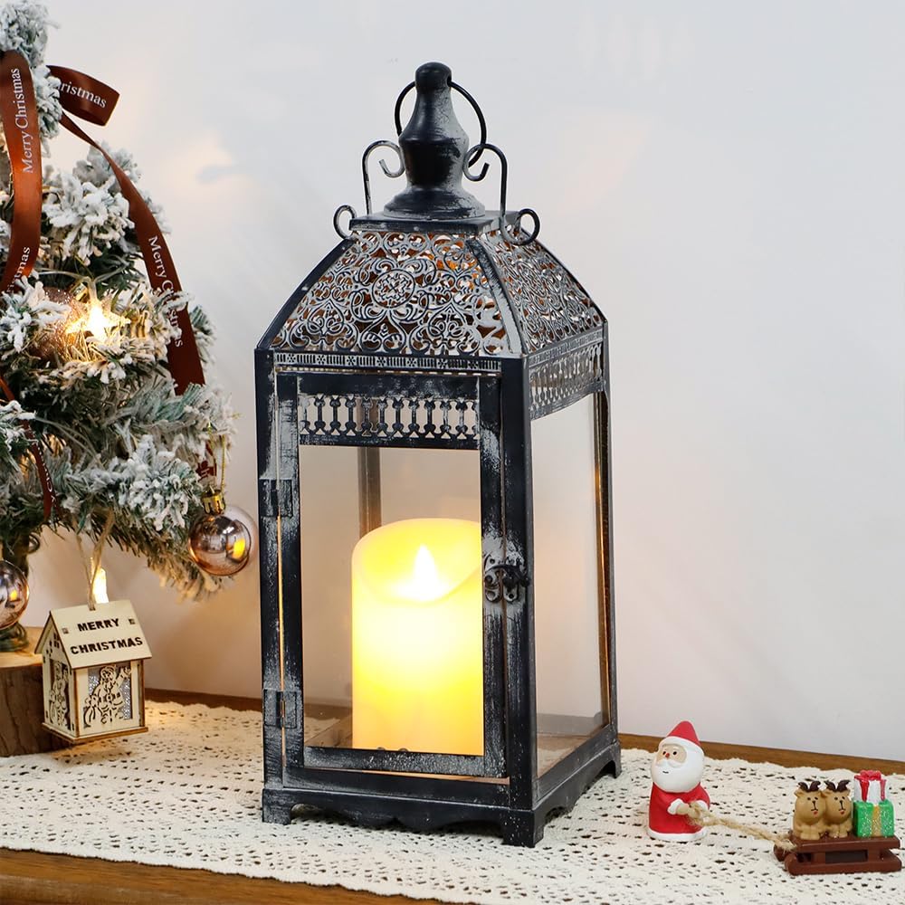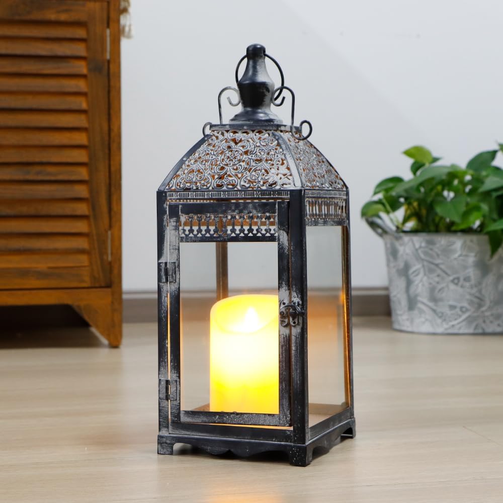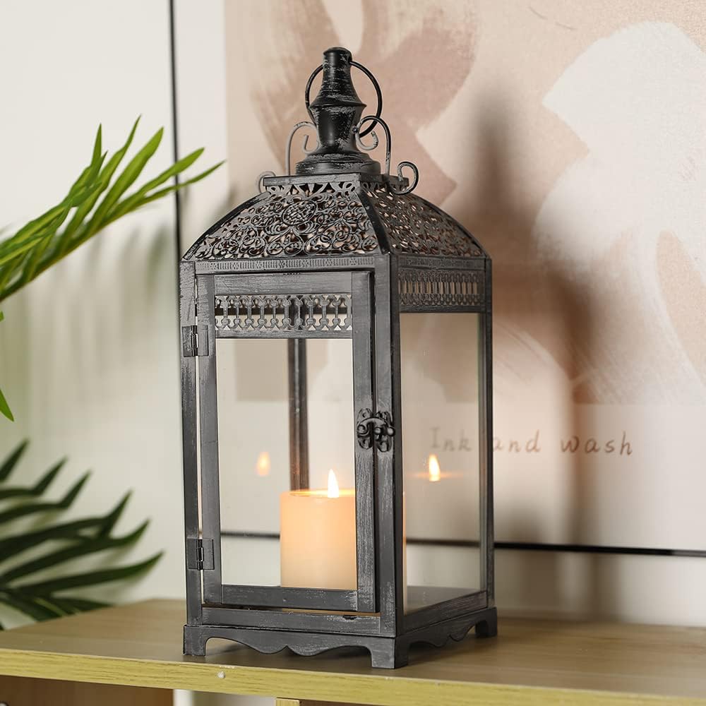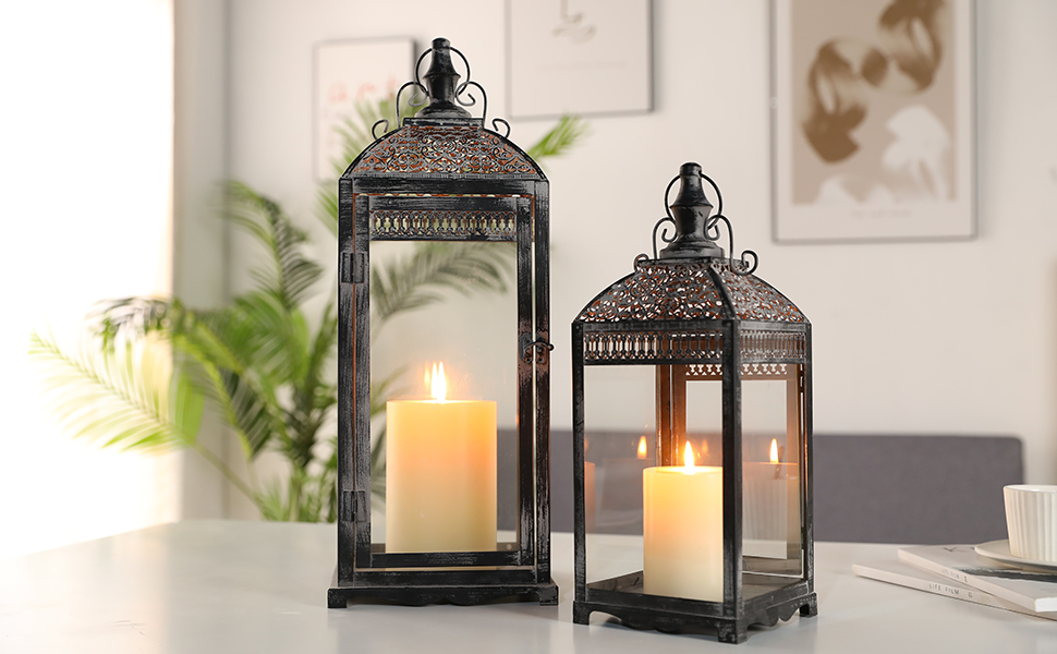 • 【فانوس شمعة معدني عتيق】 - فانوس الشمعة العتيق بالحجم الطبيعي، مع ألواح زجاجية، وجزء علوي خاص وإطار نمط ممزق باللون الأسود مع مسحوق فرشاة رمادي، يخلق هالة من سحر العالم القديم - يضيف لمسة رائعة إلى أي مساحة مع الرشاقة. زواج الجمال والعملية - دعامة لافتة للنظر للطاولات والحانات والباحات والشرفات؛ ديكور داخلي وخارجي رائع ليلاً ونهارًا.