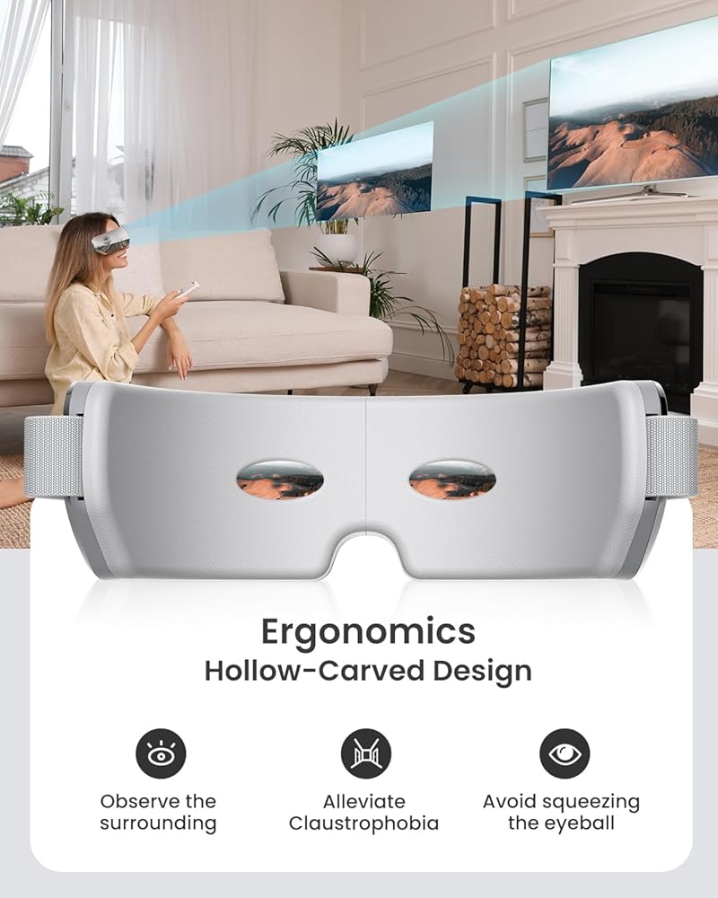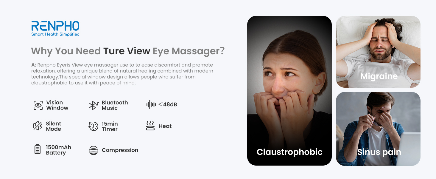 نافذة رؤية محسنة - مدلك العين RENPHO Eyeris View مصمم بفتحات للعين تسمح لك بالحفاظ على السلامة والتوازن أثناء الاستمتاع بالأنشطة المختلفة أثناء التدليك. الرد على المكالمات والقراءة وتناول وجبة خفيفة أو مشروب. تمتد الحرارة والضغط لمدلك العين هذا إلى الصدغ ليكون مدلكًا مثاليًا للصداع النصفي.
