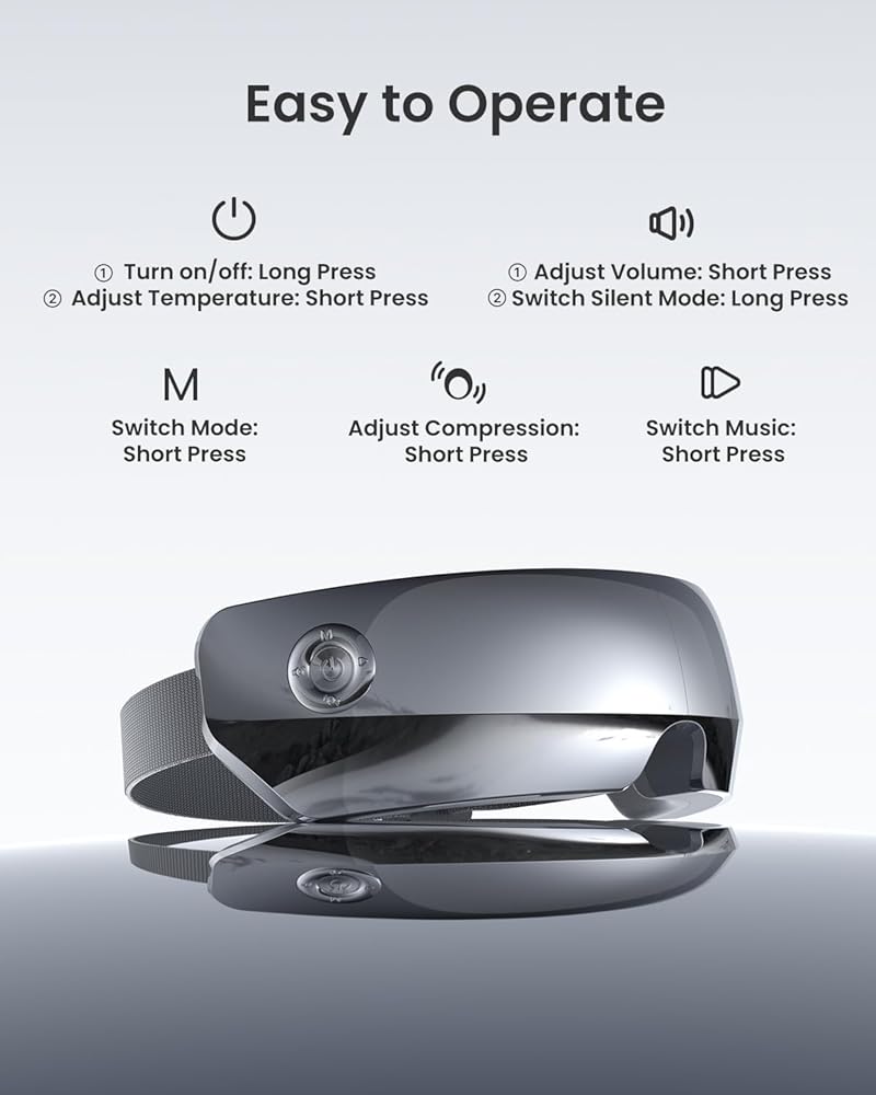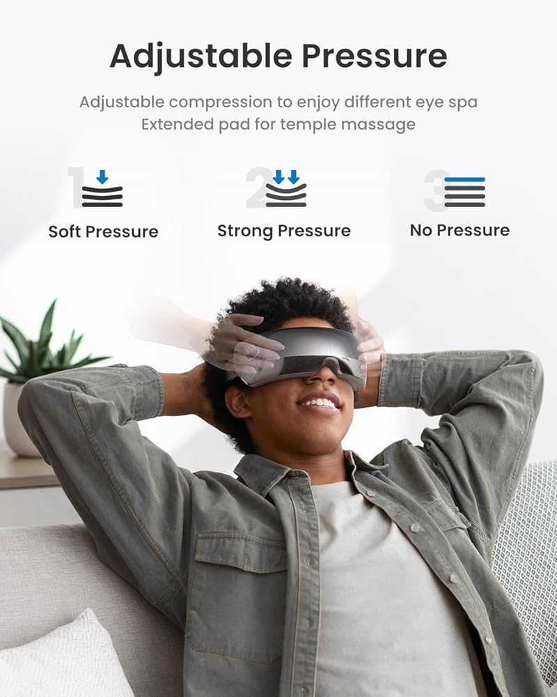 5 أوضاع تدليك قابلة للتخصيص - ارفع روتين العناية بالعين الخاص بك من خلال أوضاع التدليك المخصصة التي تجمع بين الحرارة والاهتزاز والضغط والموسيقى. يحارب جفاف العيون، ويقلل الانتفاخ، ويخفف من الصداع النصفي. يضمن المؤقت المدمج الاستخدام الأمثل، حيث يتم إيقاف تشغيل جهاز التدليك تلقائيًا بعد 10 دقائق من الاستخدام المتواصل.