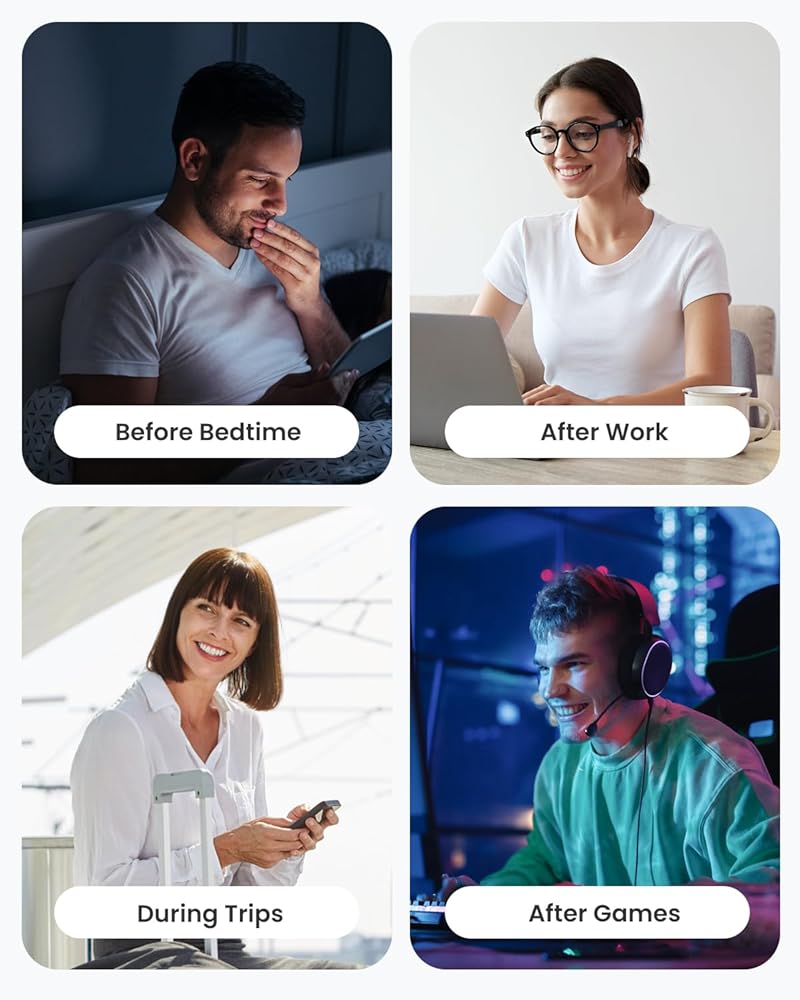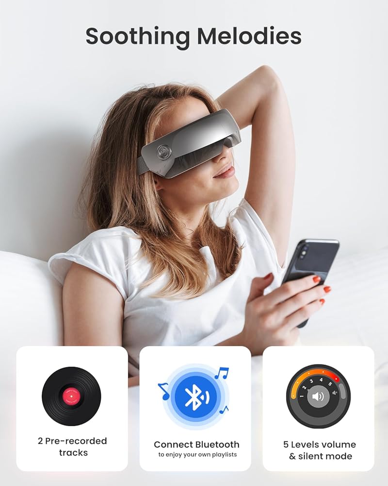 البث الصوتي واتصال البلوتوث - عزز الاسترخاء من خلال مكبرات الصوت المدمجة والمقطوعات الموسيقية الهادئة المسجلة مسبقًا. رفع مزاجك وتحسين نوعية النوم. قم بتوصيل جهاز العناية بالعين بهاتفك الذكي عبر البلوتوث للاستمتاع بقوائم التشغيل الخاصة بك. قم بتبديل المسارات بسهولة وضبط مستويات الصوت لخلق أجواء مثالية.