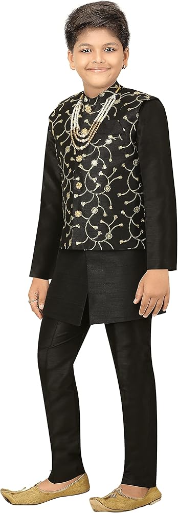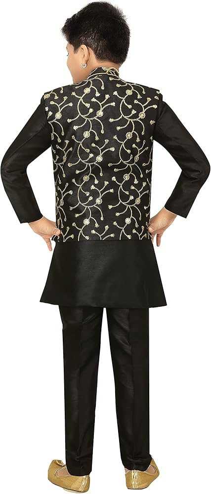 From the house of "ahhaaaa", This boys dress consists of a kurta payjama and waistcoat. The boys ethnic wear features an embroidery on it with Stone, Pearls, Gota work, banded collar and beautiful button design. Made from Banarasi silk fabric. This kids cloths have soft texture and the fit is regular for boys clothing . These party wear for boys set featuring an eye-catching design. Our brand is manufacturing boys party wear dress by best quality materials. These kids ethnic wear for special occasion like party, birthday and wedding. We select the best fabric and We are specialist in kids wear for boys. Here you can find a wide range of kids clothing for boys in kids ethnic wear which includes party wear sherwani, indo western, kurta pyjama, pathani, tuxedo, dhoti kurta, angrakha set and lot more.