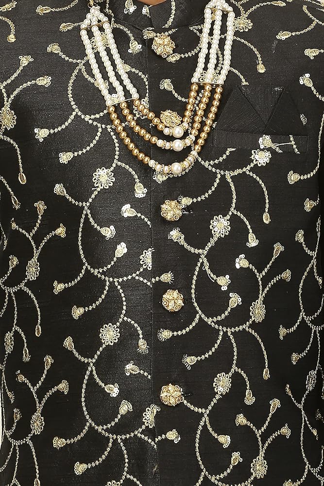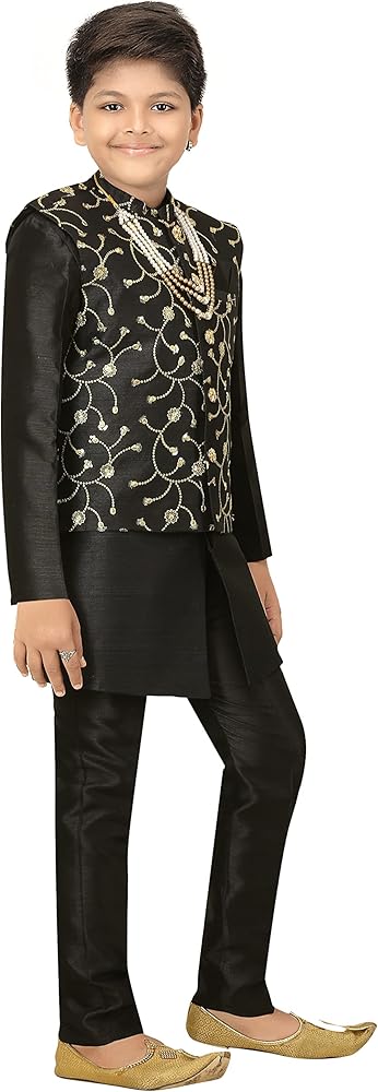 Fabric detail:- indo western/sherwani - Jakard silk; kurta and pajama -dupion silk|| Sales package - 1 Indo western/sherwani, 1 Kurta and 1 Pajama || Age group: 2 years to 15 years!