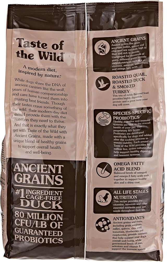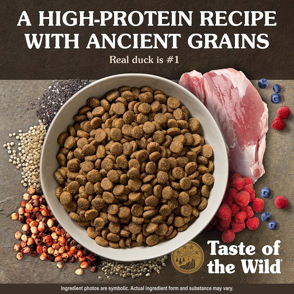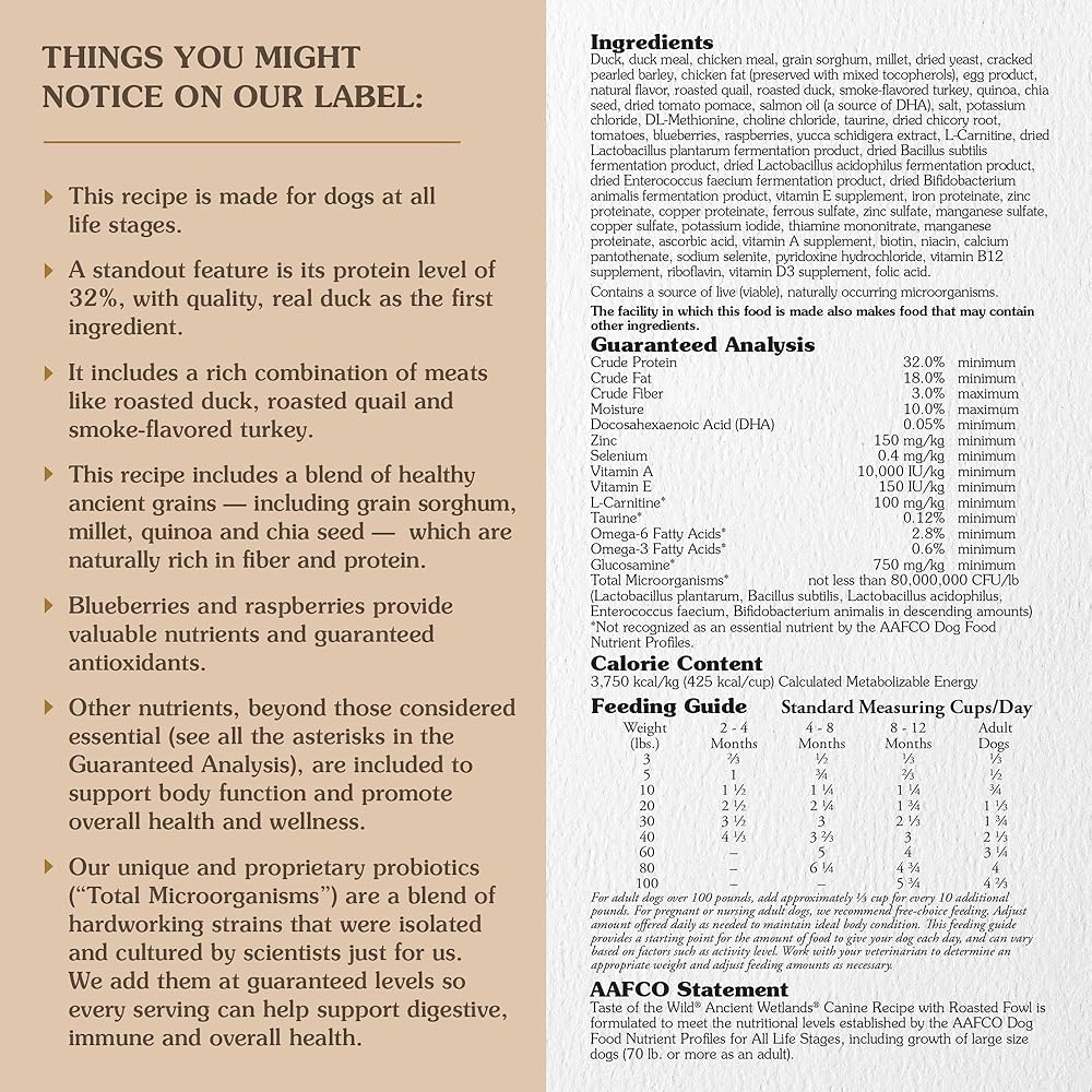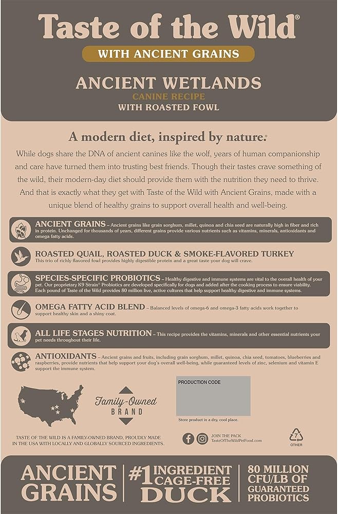 Taste of Wild Wetlands Dog Food is a grainfree formula for all life stages with sweet potatoes and peas provides highly digestible energy for your active dog. Made with real roasted and smoked fowl, this formula offers a taste sensation like no other. Supplemented with fruits and vegetables, this hearty formula delivers natural antioxidants to protect your best friend's body from the damage of everyday living, supporting a healthy immune system and overall good health. Your dog craves a taste of the wild. Go ahead and give him one. Protein: 32 Fat: 18 Calories: 3,750 kcal/kg (375 kcal/cup) Calculated Metabolizable Energy Please Note: All food is shipped via ground delivery, only to the Contiguous (48) States. Please allow 7 to 10 days for your delivery to arrive. (More Info)