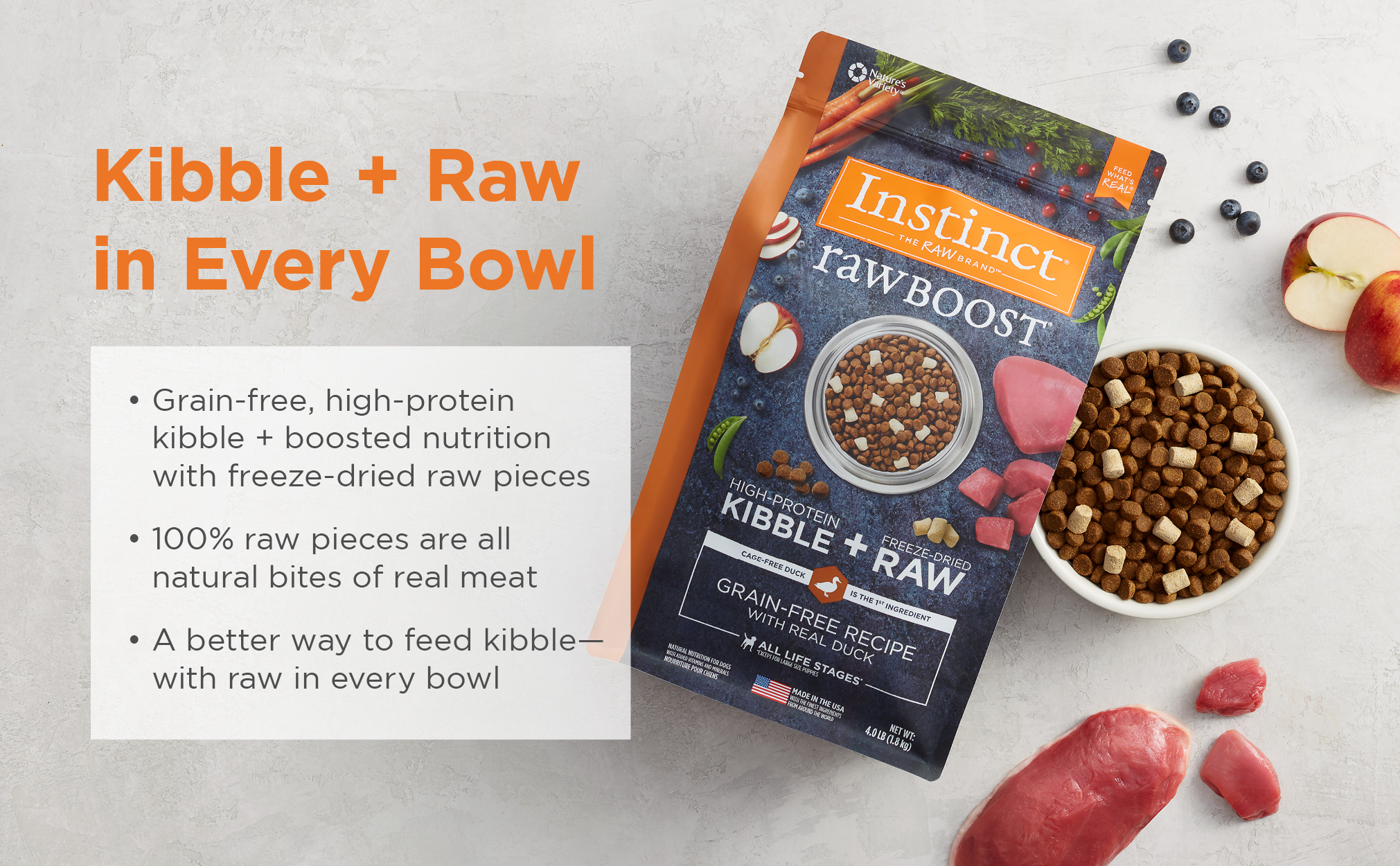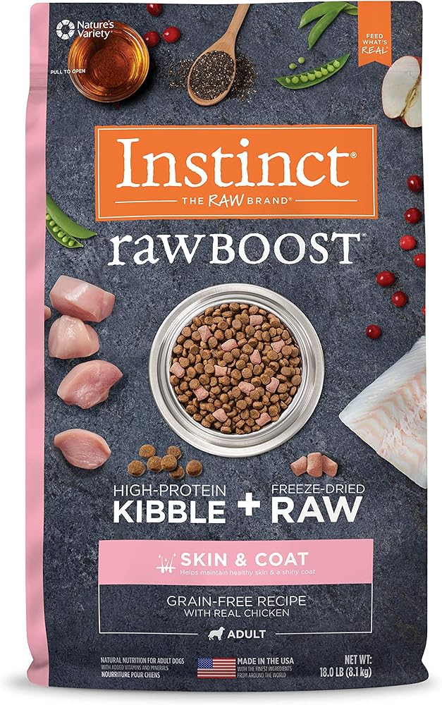 GRAIN FREE DOG FOOD WITH FREEZE DRIED RAW FOR SKIN & COAT HEALTH: Instinct Raw Boost natural dog food combines high protein, grain free kibble with all natural bites of freeze dried raw. Cage free chicken is the #1 ingredient plus functional ingredients.