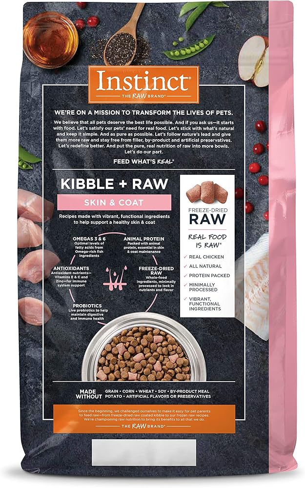 High protein, grain-free kibble plus freeze-dried raw, Instinct Raw Boost Grain-Free Recipe with Real Chicken for Skin & Coat Health is a better way to feed. Recipes made with vibrant, functional ingredients to help support skin & coat health. Unlock your dog's potential to thrive and put more of the pure, real nutrition of raw into every bowl.