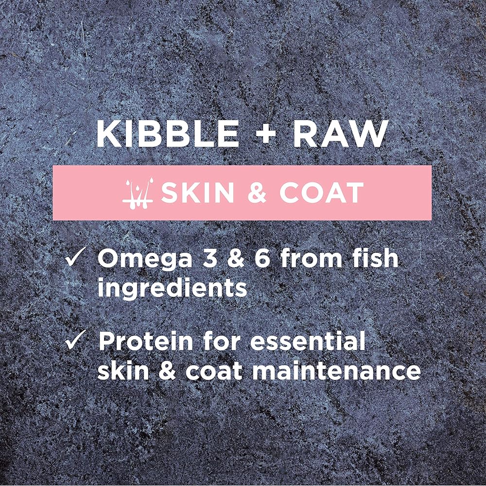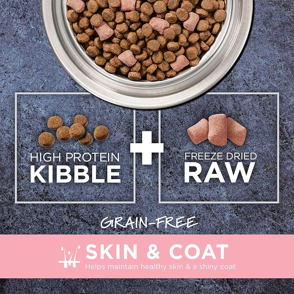 SKIN AND COAT HEALTH DRY DOG FOOD + FREEZE DRIED RAW PIECES: Made with optimal levels of Omega 3 & 6 from menhaden fish meal and salmon oil, plus probiotics & antioxidants. Made without grain, potato, corn, wheat, soy, artificial colors or preservatives.