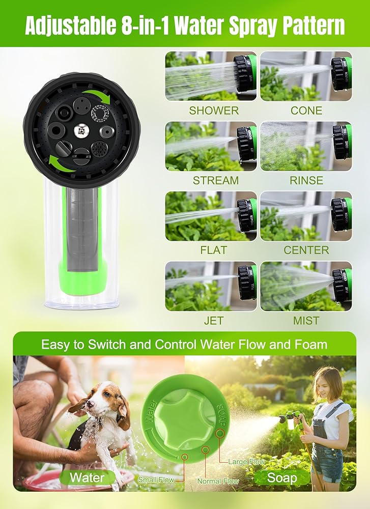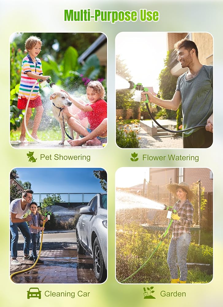 【8 in 1 Spray Patterns】The pup jet dog wash foam sprayer comes with 8-in-1 sprinkle head, rotate the nozzle to choose the mode you need (rinse, flow, flat, center, jet, shower, spray and cone), it can meet your various usage needs, suitable for pet shower, vehicle washing, watering garden, floor, lawn and plants, play water game, clean the roof and so on.