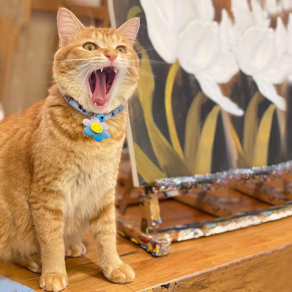تصميم مطرز لطيف جدًا: يأتي طوق القطط البناتي هذا مع جرس ذهبي وقلادة لطيفة جدًا. الدانتيل الملون المطرز عالي الجودة وجميل ومميز بشكل خاص. توجد بطانة ناعمة لذا فإن طوق القطط هذا لن يفرك الفراء أو يؤذي الجلد ويحمي رقبة القطة من التهيج.