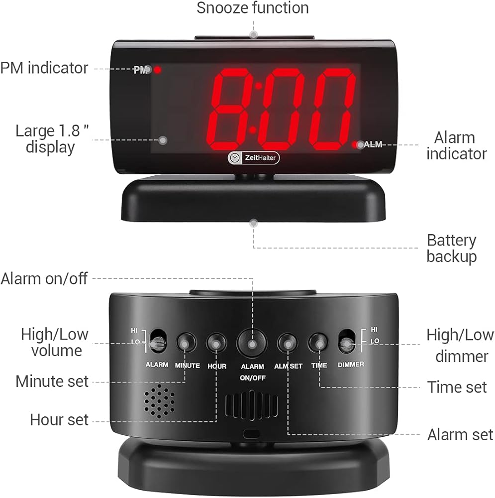 ZOOS ساعة منبه لغرفة النوم 5 بوصة كبيرة LED ساعة رقمية لكبار السن، منبه بسيط خافت لغرف النوم، حجم قابل للتعديل/غفوة/بطارية احتياطية/قاعدة دوارة هدية للأطفال المسنين في المنزل والمكتب