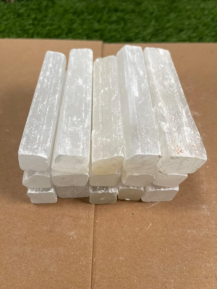 3.75-4.25 inch size Only selenite is included. With your purchase other items are used as a sample. There are many different ways you can use Selenite crystals. A simple energy shifting technique you can do at work, or in your home, is to sit in a chair while placing your bare feet on a selenite wand or stone. As you sit quietly, breathe and feel the energy of the Earth under you feet. Allow yourself to relax and let go. Within 15 minutes, clarity and balance will be restored within your body. To cleanse your aura, take a selenite wand and use it like it's an eraser. Comb the crystal up and down your body, visualizing it sucking all the negativity, anxiety and worries from your day away. Make sure you start at the top of your head, moving to the bottom of your feet, about 5 inches away from the body, and let the Selenite healing crystal energetically cleanse you. This simple technique is extremely powerful to do, in less than 5 minutes, if you are around large groups of people or find yourself around negative people or environments. This energy clearing technique helps to cleanse and purify your aura, making sure that you don't pick up on other peoples' energy and unwanted “stuff”. A woman, who space clears ghosts and entities from environments, told me that she always places selenite crystals on the windowsills and in the corners of rooms that she has cleared. She believes that ghosts and entities do not like to occupy spaces where Selenite resides. I am passing on the information that she shared with me—as always make your own opinion. However, I have personally selenite crystals in all the rooms of my home, as well as under my bed, and notice that I sleep like a baby. For space and energy clearing, you can also burn white candles in a selenite candle holder. This is a simple, and beautiful, way to keep the energy clear and cleansed while there are many people in your home. Selenite crystals help to remove all energy blockages in the body. Place a selenite wand