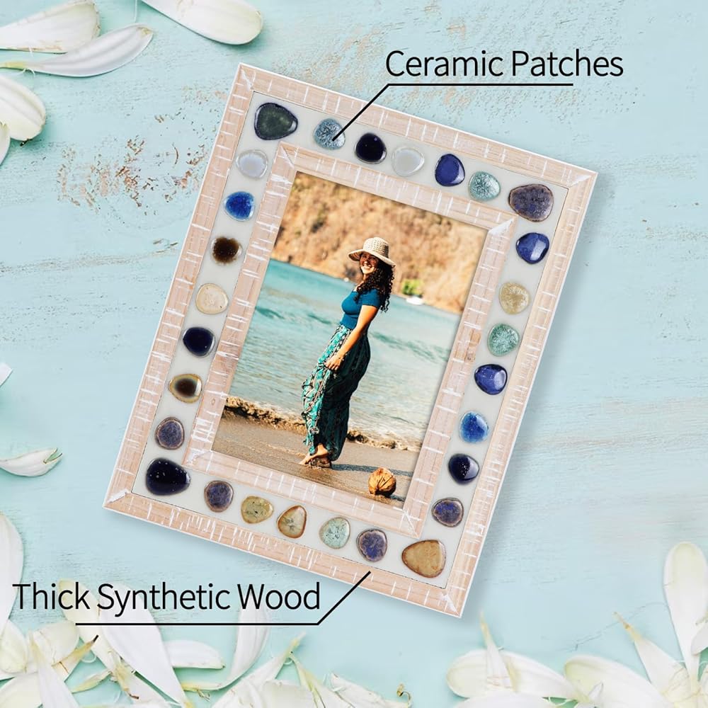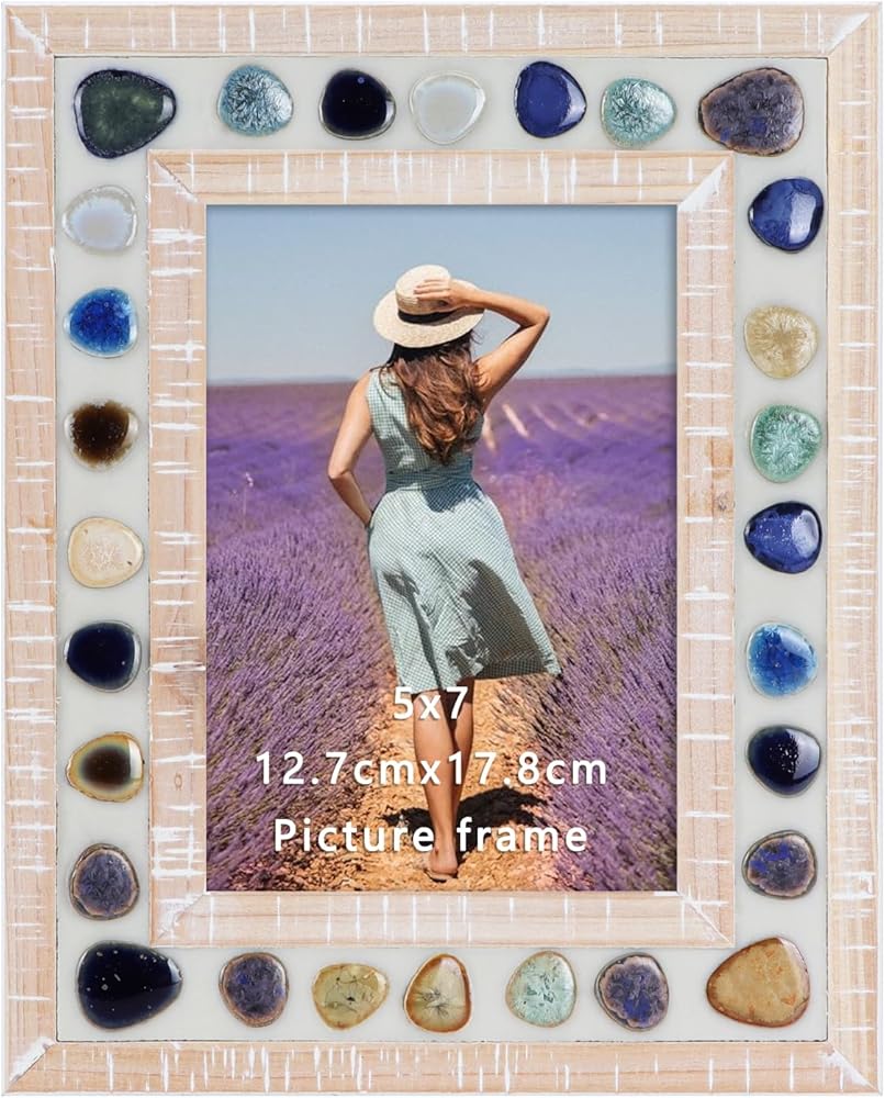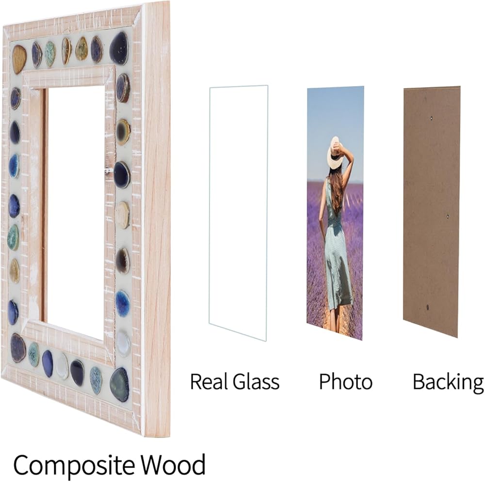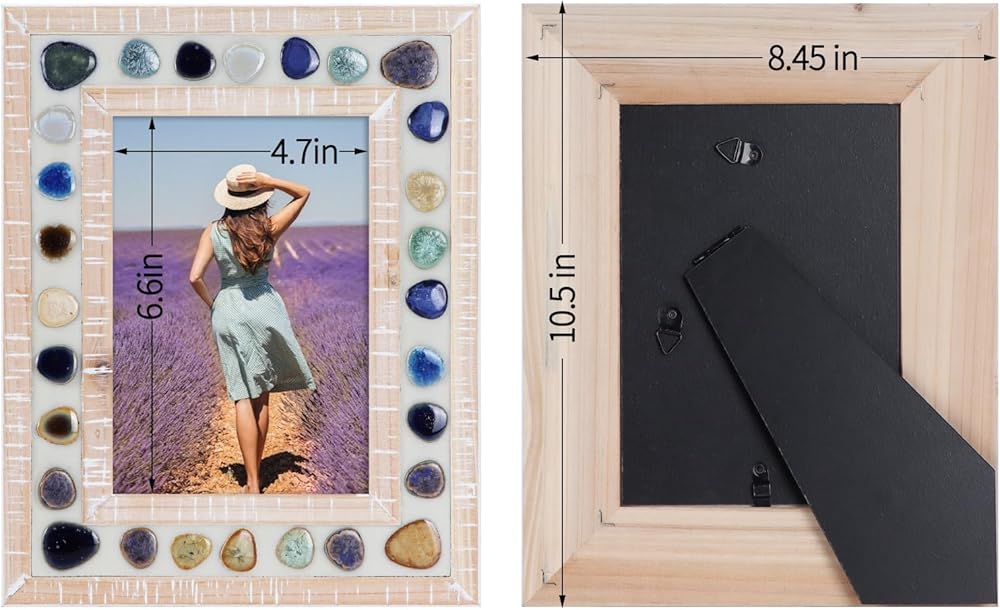 Stylish Design: This beautifully designed 5x7 picture frame combines a thick and wide wood photo frame with colorful ceramic patches to create a retro unique visual effect