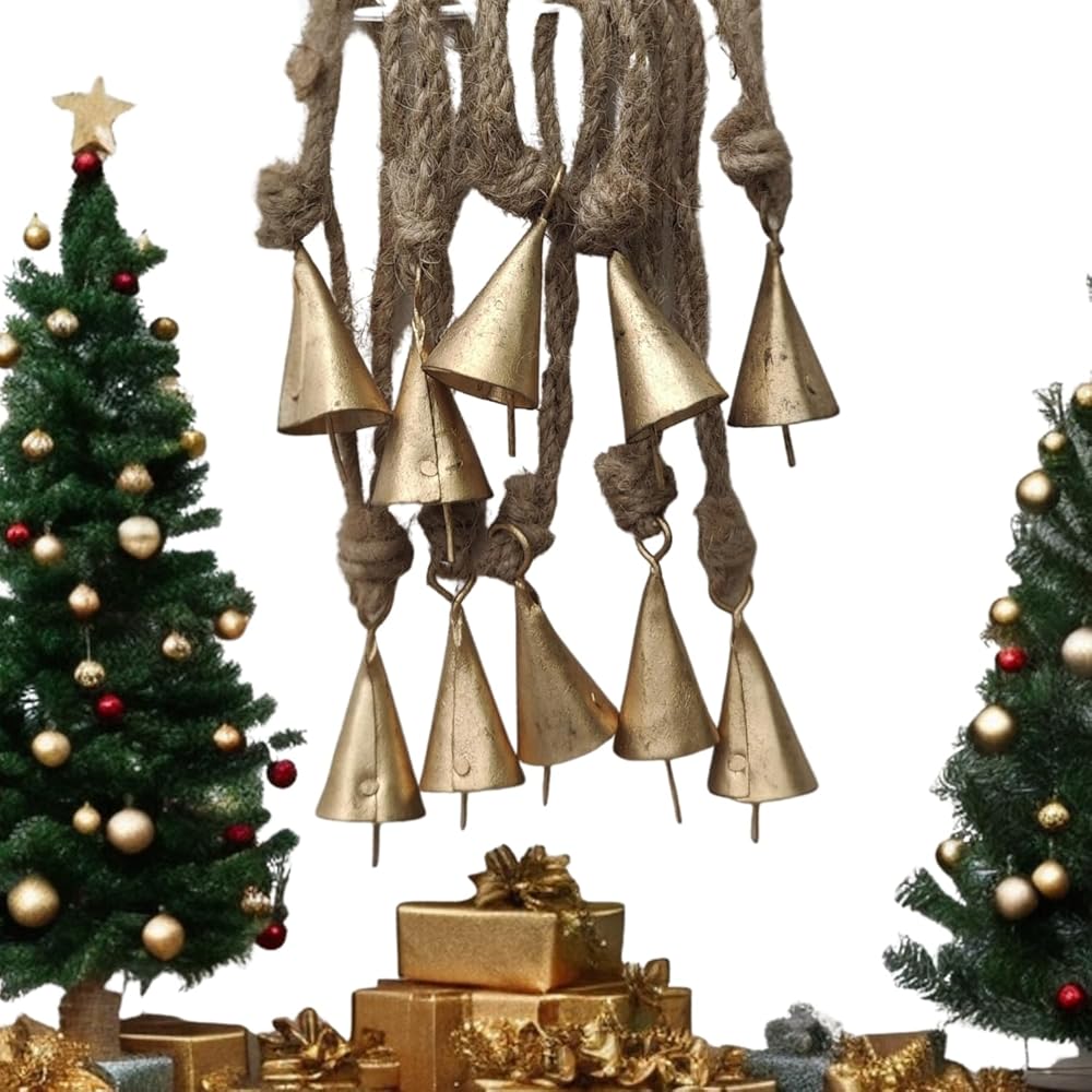 "Introducing Harmony Cow Bells: This collection of 10 distinct 2-inch bells is meticulously handcrafted, offering a blend of rustic and vintage charm. Each bell is adorned with a golden brass coat and undergoes a fire-baking process, resulting in a unique rustic brown shade that enhances its traditional appeal. Crafted from recycled iron sheets, these bells are not only eco-friendly but also unique in their construction, ensuring no two are alike. They're an ideal addition to any decor, be it for Christmas, as wall hangings, or part of a larger decorative setup. Durable and full of character, these bells are perfect for adding a touch of historical elegance to your space. Suitable for a variety of occasions, from festive celebrations to everyday home embellishment, the Harmony Cow Bells stand out as a testament to fine artisanship, merging the past's aesthetic with modern sustainability."