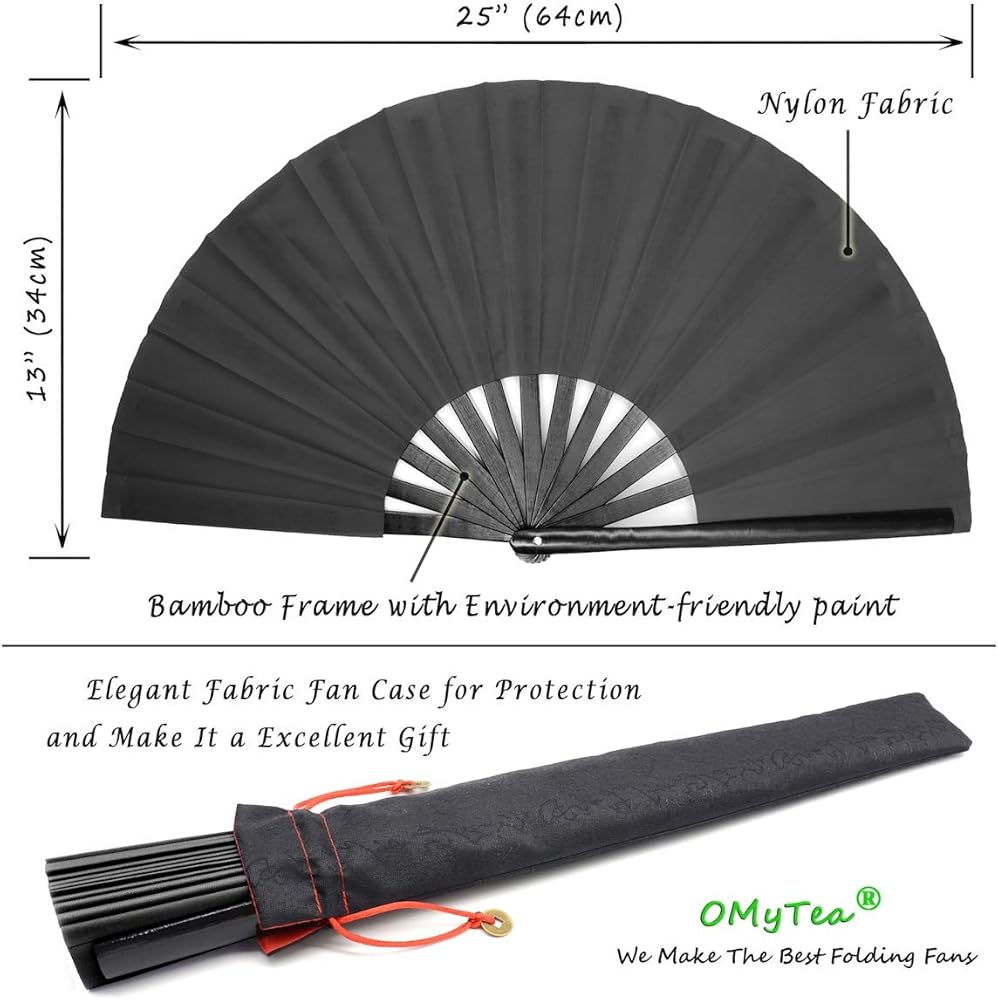 مروحة يدوية قابلة للطي لمهرجان الهذيان الكبير من OMyTea Bamboo للرجال والنساء - مروحة محمولة باليد بلون صيني ياباني Kung Fu Tai Chi مع حافظة قماش - للأداء والديكورات والرقص والهدية (أسود)
