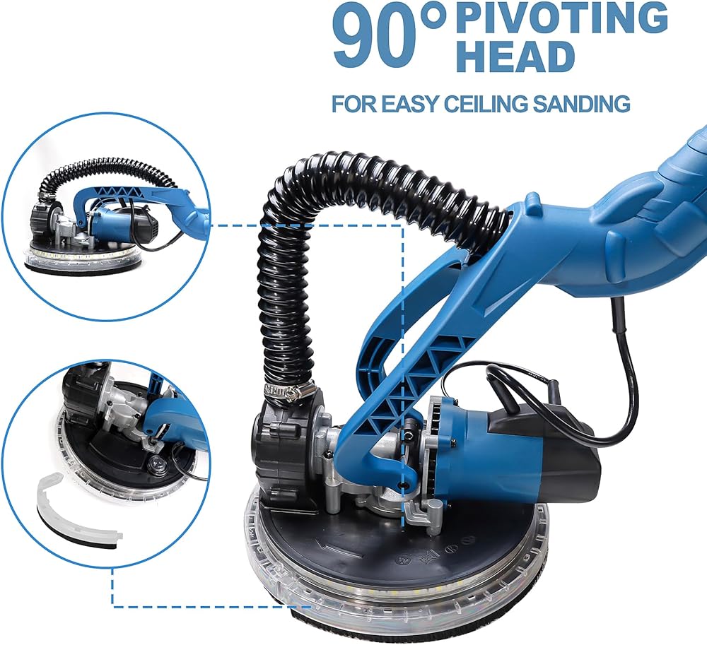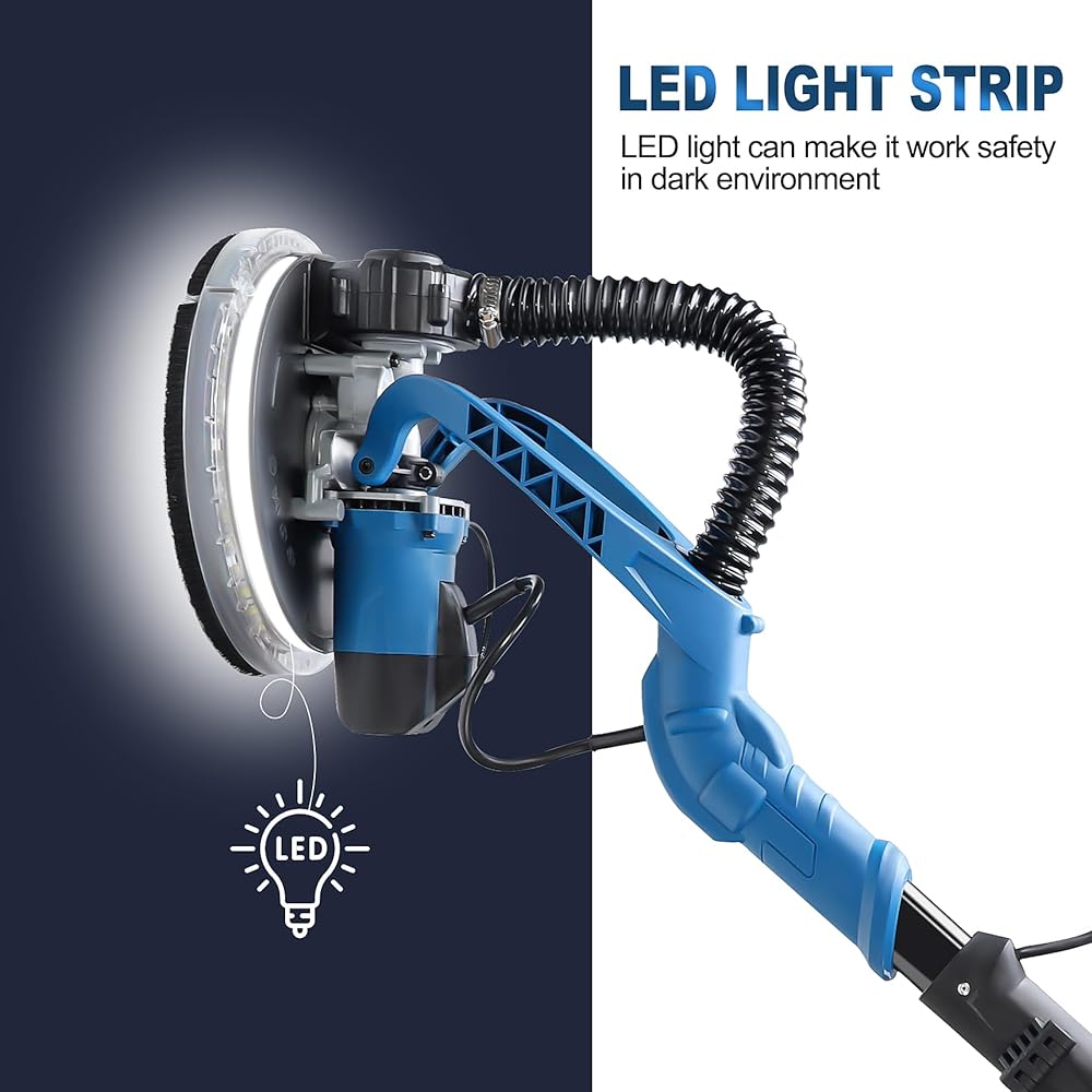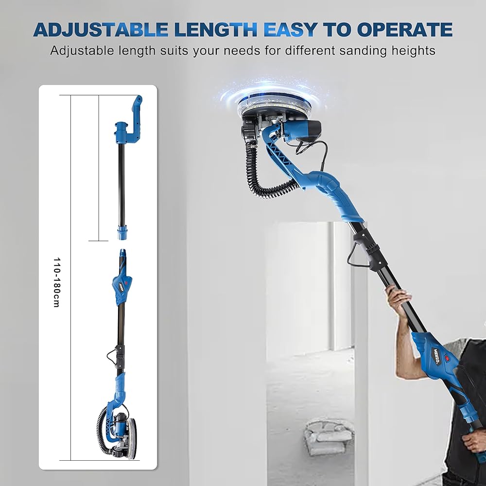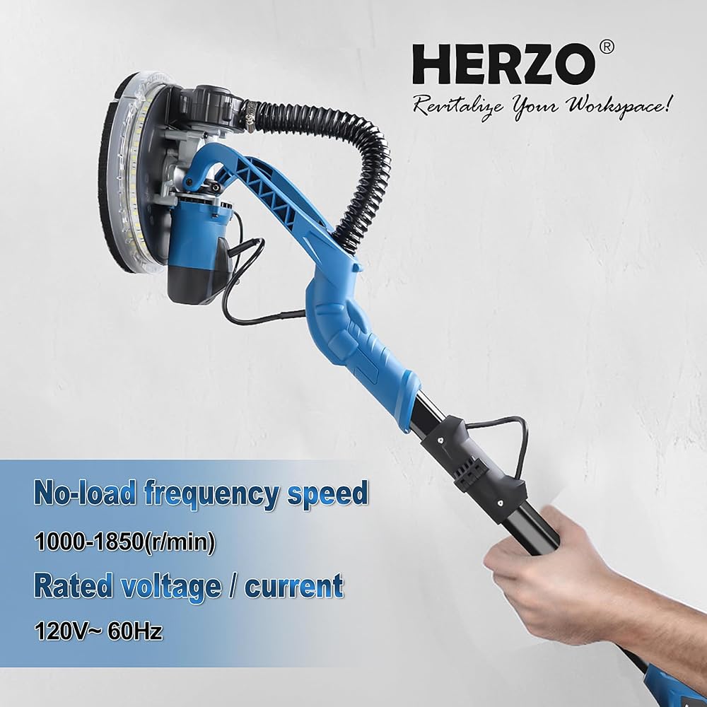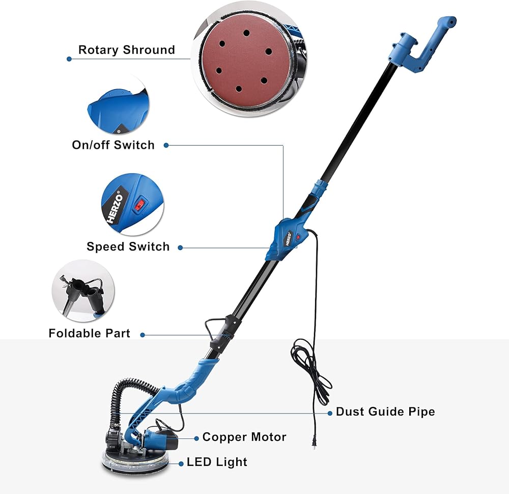 ماكينة صنفرة الحوائط الجافة من هيرزو، ماكينة صنفرة كهربائية بقدرة 750 وات 6.5 أمبير مع سرعة متغيرة 1000-1850 دورة في الدقيقة، أداة صنفرة حائط قوية مرفقة بالمكنسة الكهربائية مع 12 قطعة من أقراص الصنفرة، ومقبض قابل للتمديد، وإضاءة LED