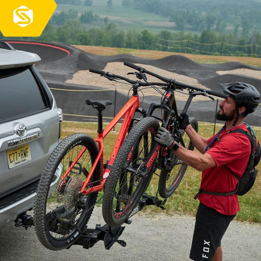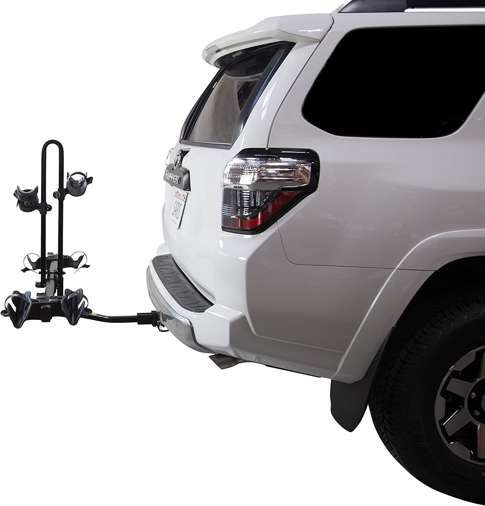 Hitch mounted rack carries up to two bikes, of up to 35 pounds each