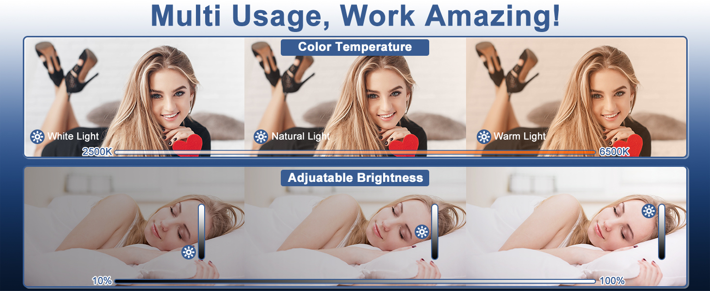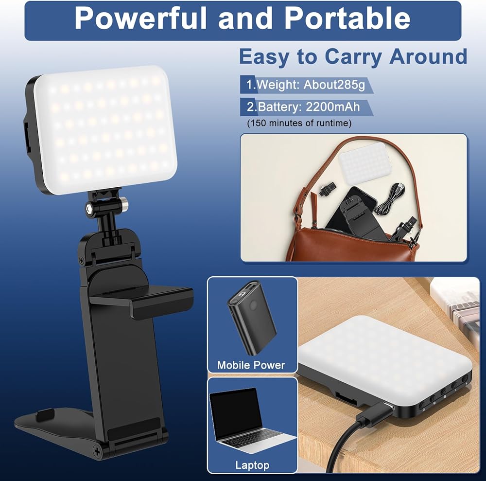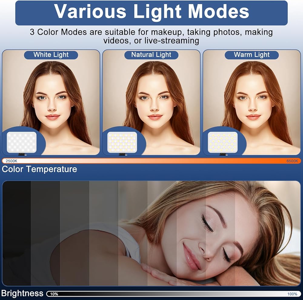 【3 أوضاع إضاءة و10 مستويات سطوع】مصباح السيلفي المحمول 60 LED مزود بـ 3 أوضاع إضاءة خافتة (أبيض، أبيض + دافئ، دافئ)، حتى تتمكن من ضبط إضاءة التكبير/التصغير للهاتف من 10% إلى 100%. السطوع، درجة حرارة اللون 2900K-6500K قابلة للتعديل، للحصول على الإضاءة المثالية في ظروف مختلفة. متوافق مع الهواتف والأجهزة اللوحية وأجهزة الكمبيوتر المحمولة وأجهزة الكمبيوتر، ويمكنك أيضًا استخدامه كمصباح وإضاءة للطوارئ وإضاءة المكياج وأكثر من ذلك!