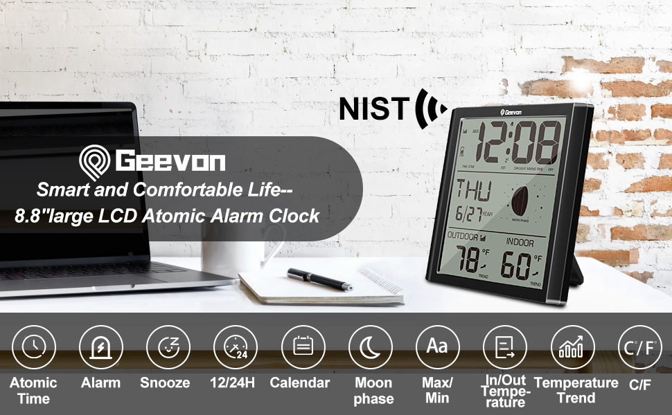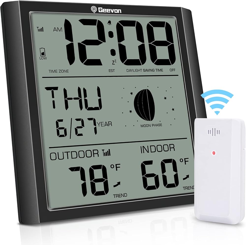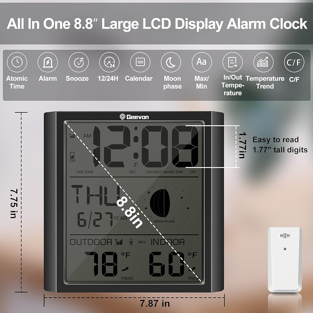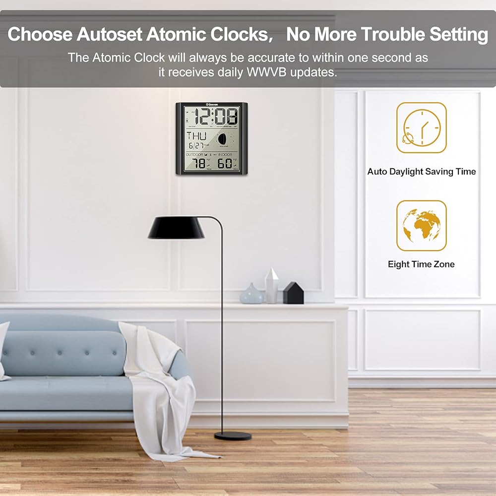 جيفون ساعة حائط ذرية رقمية، ساعة منبه ذرية ذاتية الضبط مع درجة حرارة داخلية وخارجية، تقويم، مرحلة القمر للمنزل والمكتب وكبار السن (مستشعر لاسلكي خارجي) تحديث
